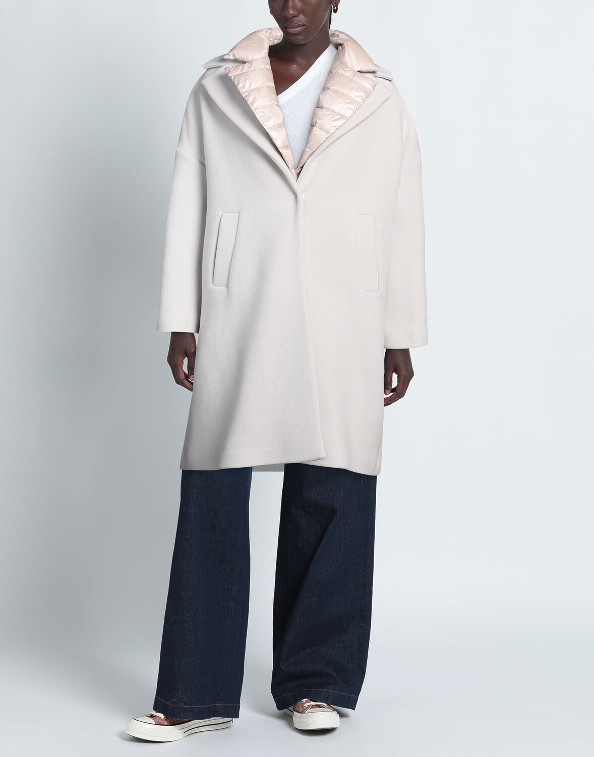 Фетр, ракушка, без аппликаций, одноцветное изделие, воротник с лацканами, однобортный, длинные рукава, внутренняя часть из гусиного пуха, наполнитель синтепон, множество карманов, содержит нетекстильные части животного происхождения, ручная стирка, нельзя отбеливать, нельзя сушить в стиральной машине