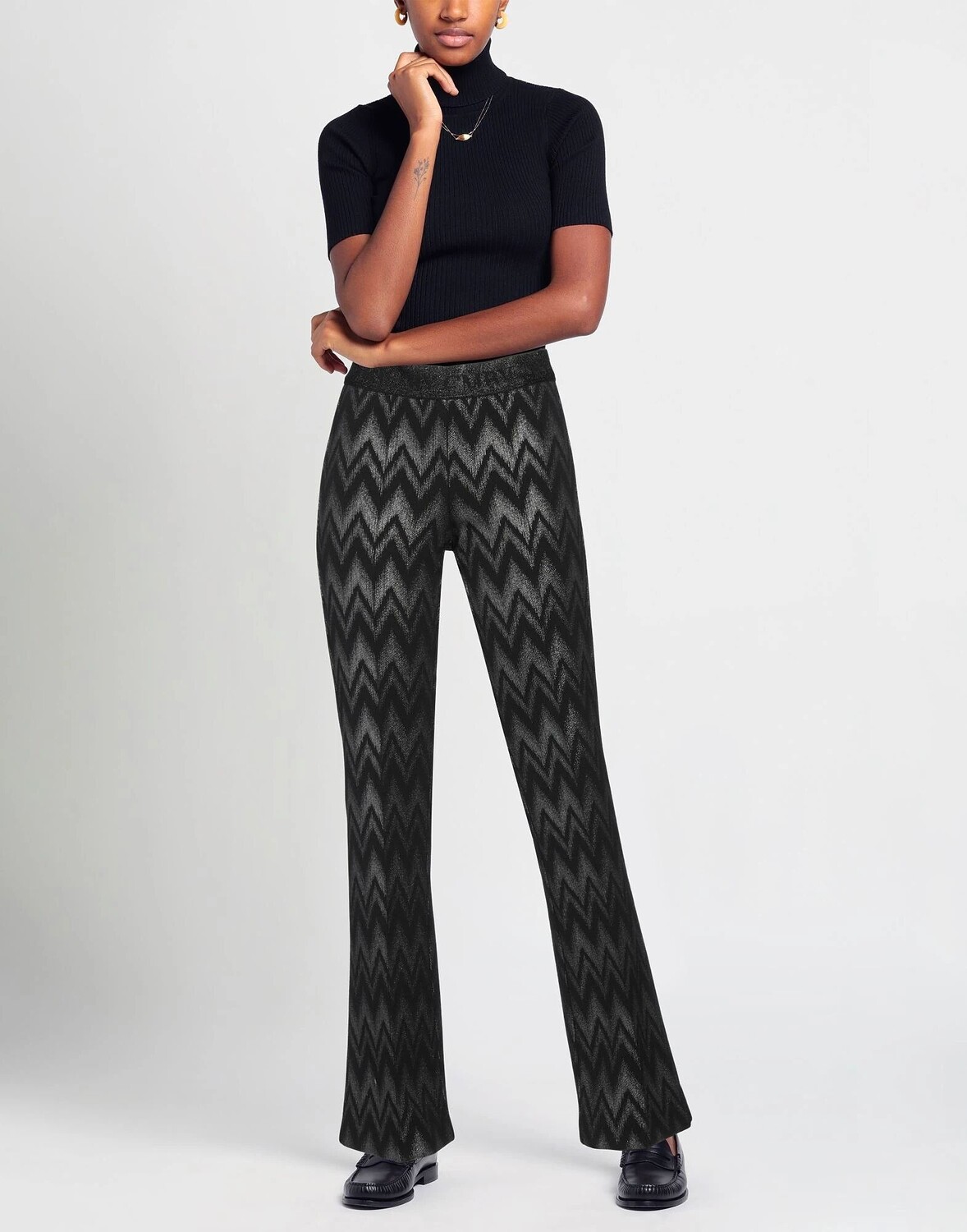 Трикотаж, металлик, легкий трикотаж, логотип бренда, узор «елочка», резинка на талии, стандартный крой, без карманов, стрейч, ручная стирка, нельзя отбеливать, нельзя сушить в стиральной машине, брюки-клеш