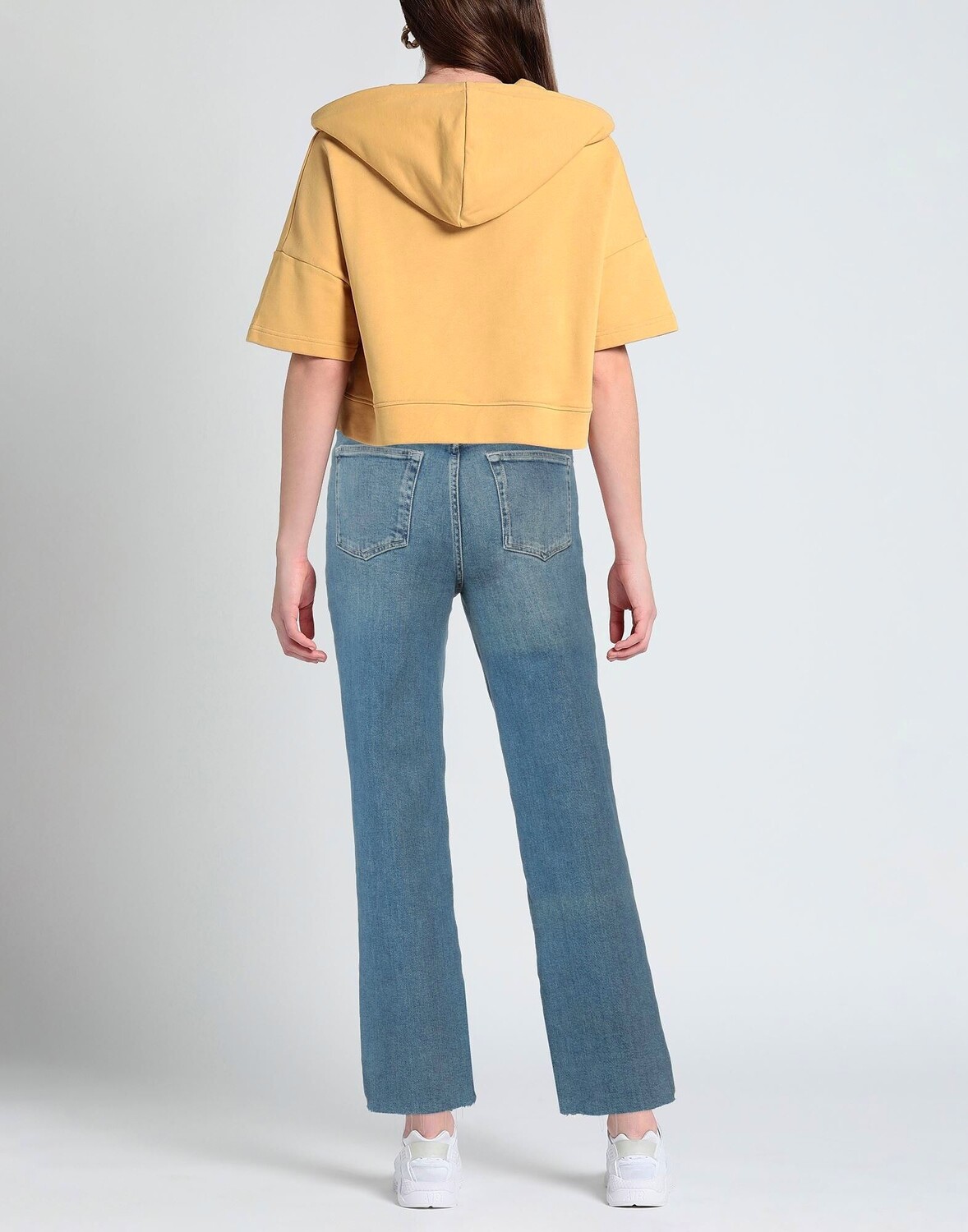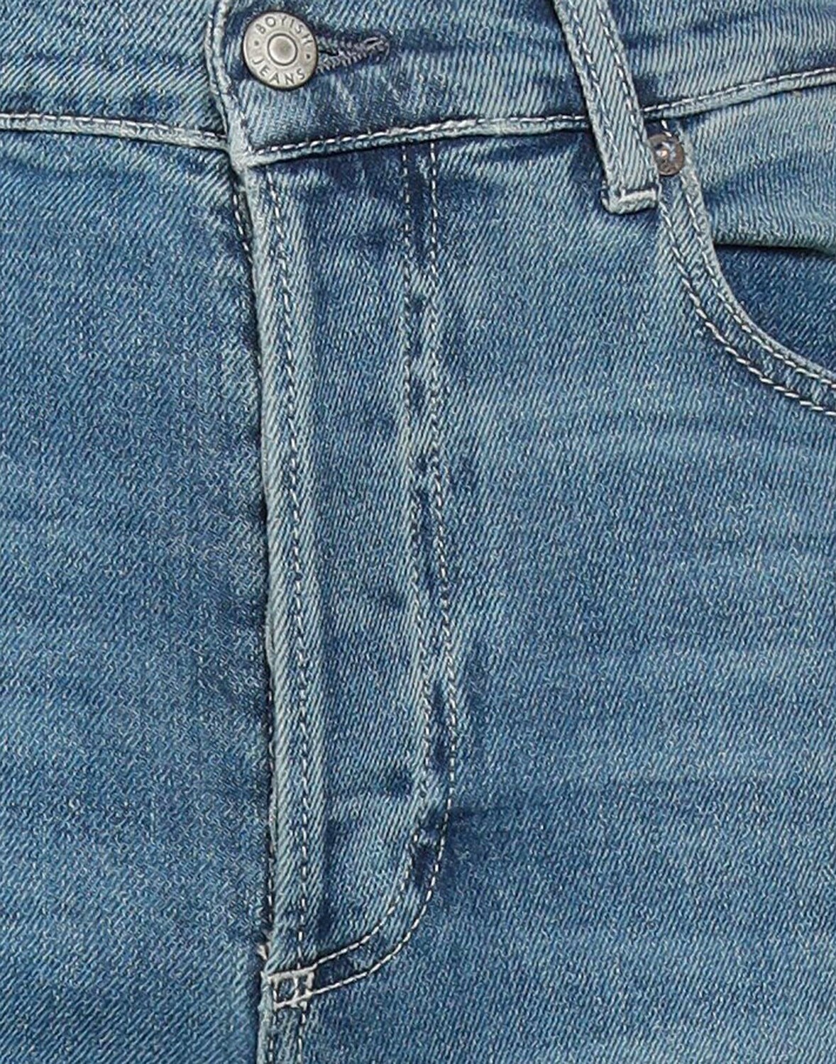 Деним, выцветший, логотип бренда, одноцветное изделие, средняя потертость, высокая талия, пуговицы, необработанный подол, пять карманов, модель бойфренд