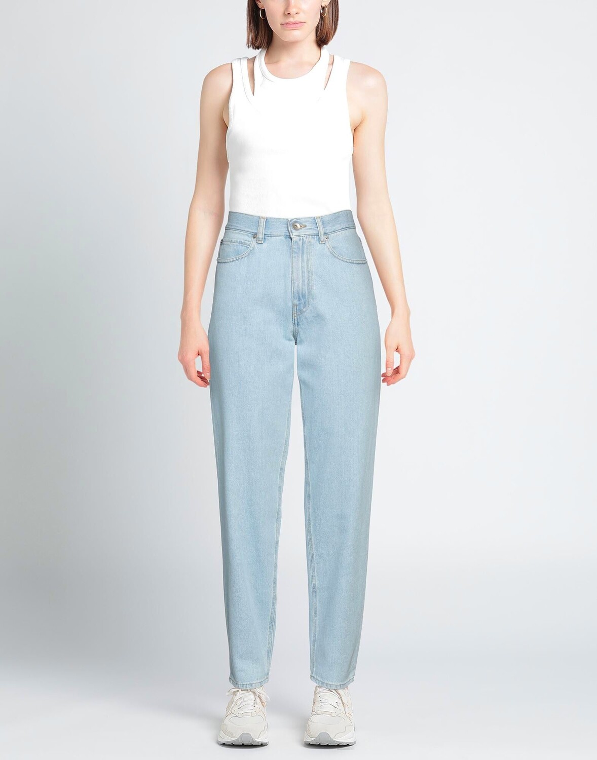 Деним, плёнка, без аппликаций, одноцветное изделие, светлая стирка, завышенная талия, шлевки для ремня, прямые брючины, стандартный крой, застежка-молния, 1 пуговица, пять карманов, модель прямого кроя