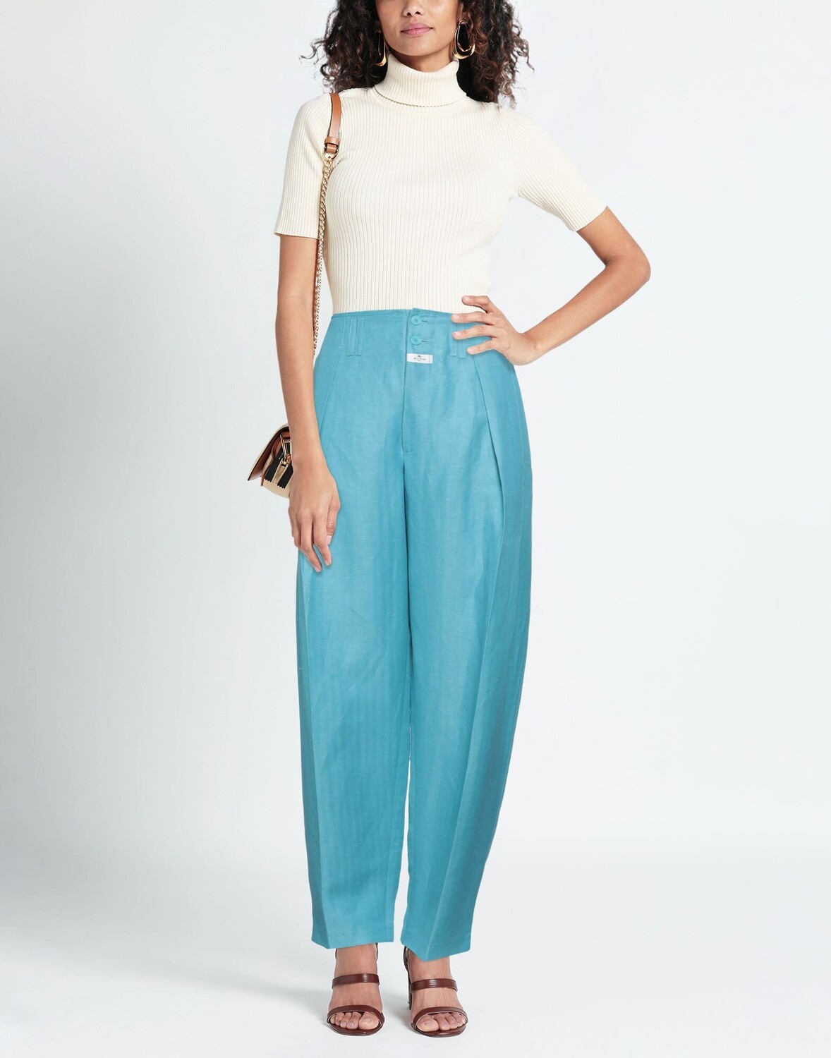 Полотняное переплетение, логотип бренда, вытачки, одноцветное изделие с аппликациями, шлевки для ремня, завышенная талия, зауженная брючина, стандартный крой, 2 пуговицы, застежка-молния, множество карманов, брюки