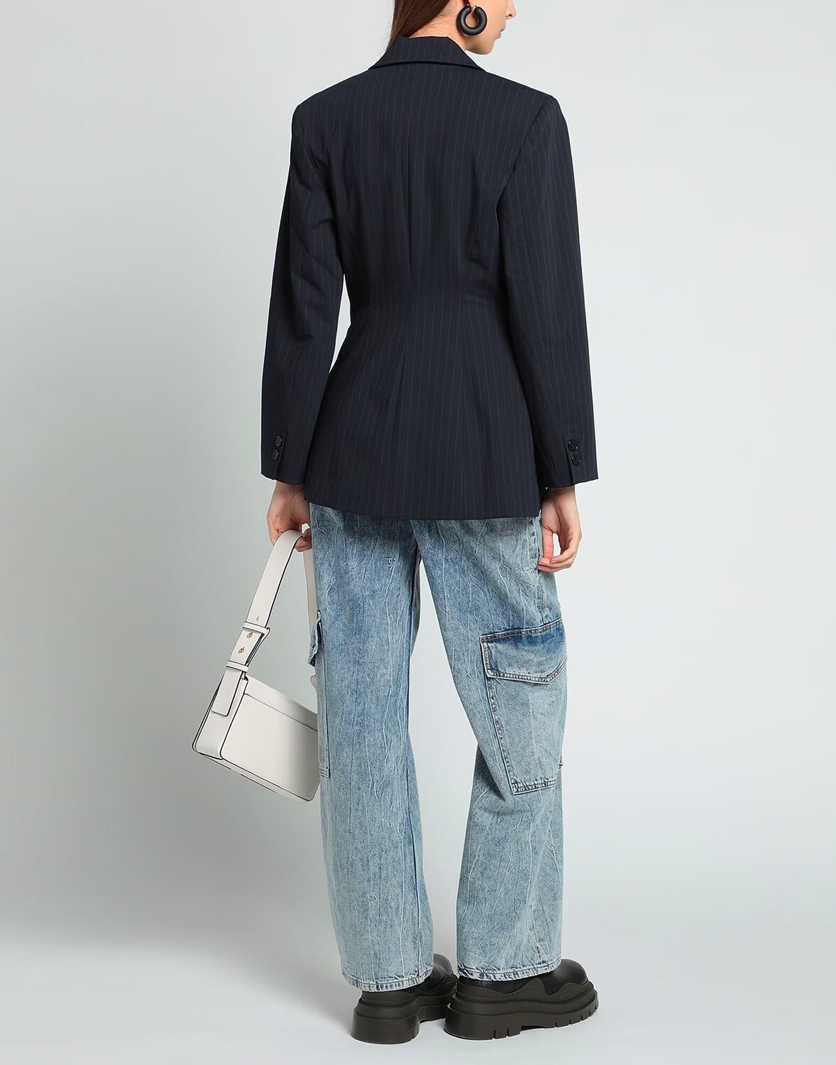 Ткань, логотип бренда, в тонкую полоску, воротник с лацканами, длинные рукава, внутри на подкладке, застежка на пуговицы, множество карманов, стрейч, химическая чистка, нельзя отбеливать, нельзя сушить в стиральной машине, однобортный пиджак