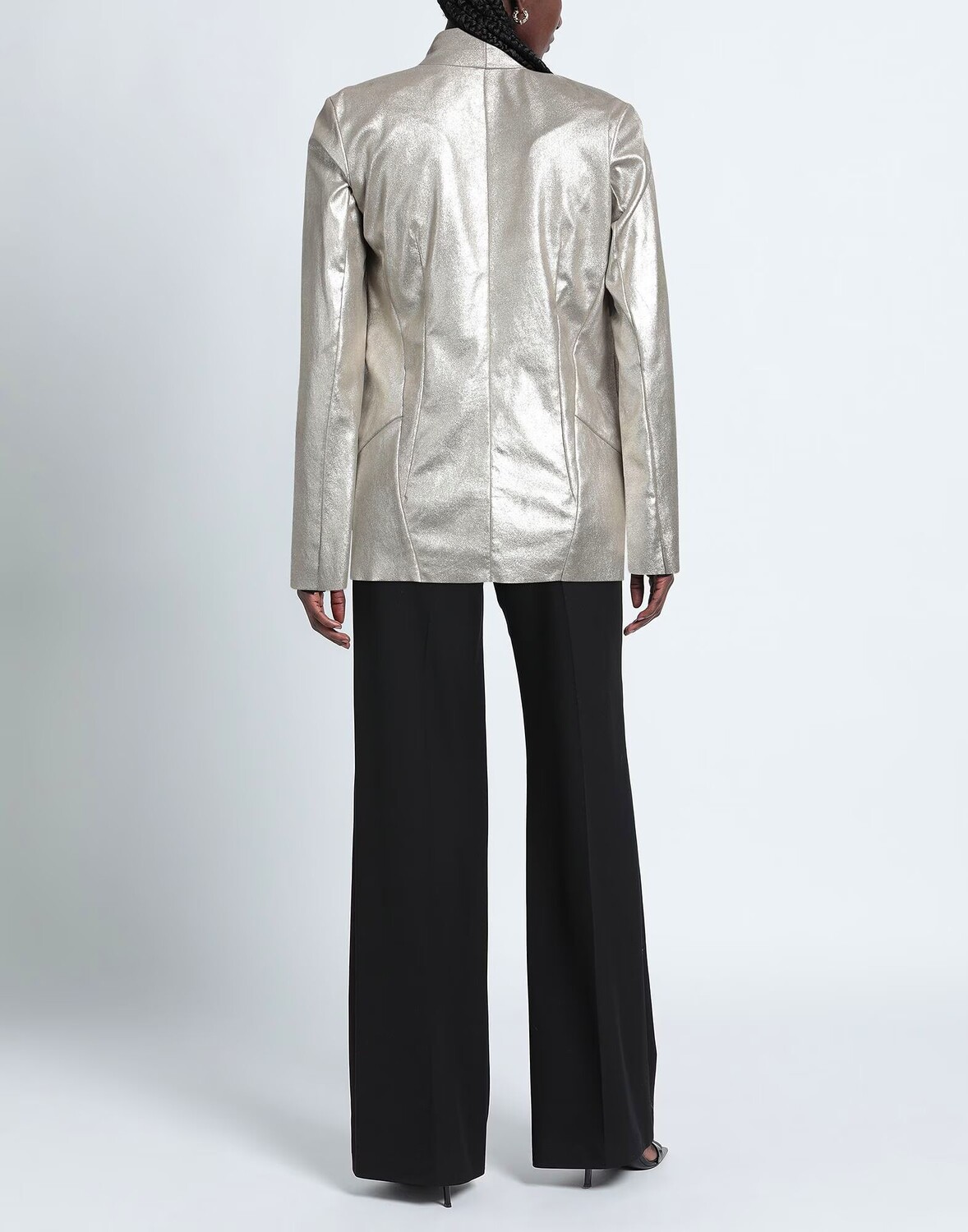 Кожа, эффект ламинирования, без аппликаций, одноцветное изделие, глубокий вырез горловины, однобортный, длинные рукава, на подкладке, множество карманов, содержит нетекстильные части животного происхождения, пиджак однобортный