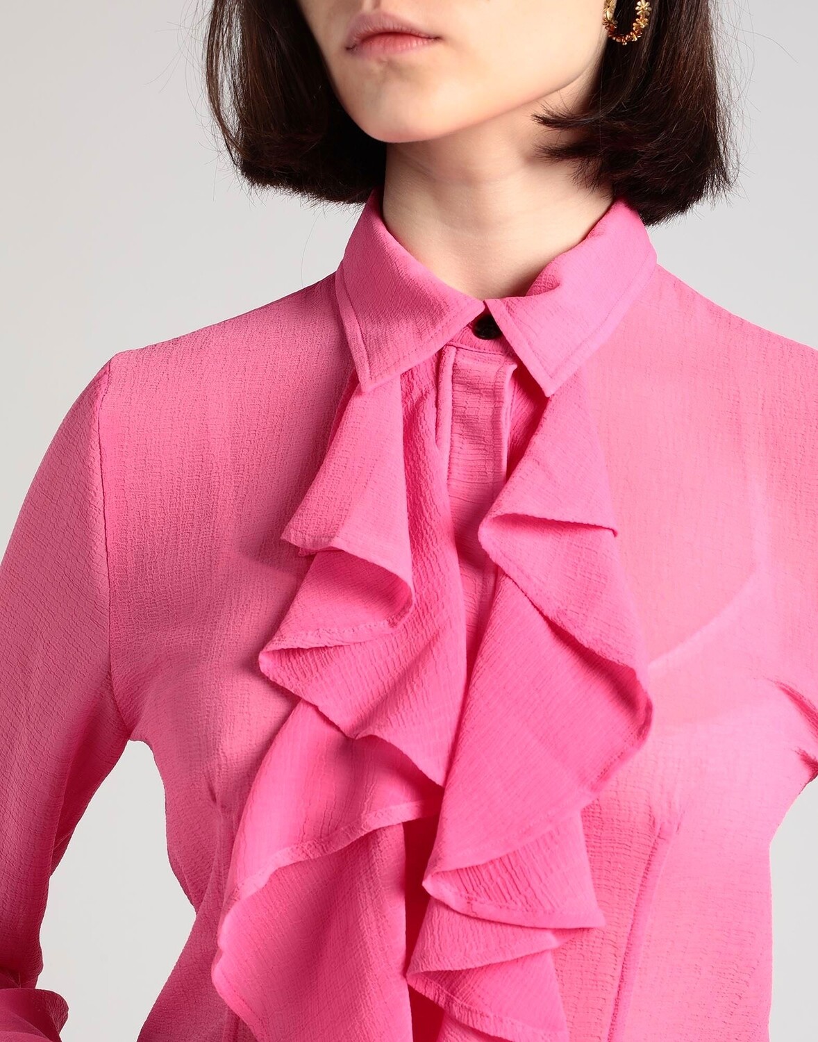 Шифон, оборки, одноцветное изделие, классический воротник, длинные рукава, застежка на пуговицы, без карманов, машинная стирка или химчистка, нельзя отбеливать, нельзя сушить в стиральной машине, рубашка со сборками