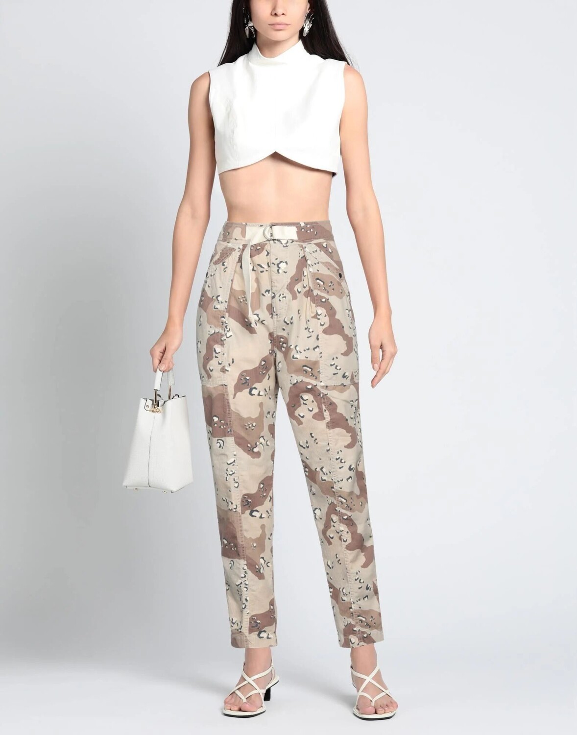 Саржа, ремень, логотип бренда, леопардовый принт, камуфляжный принт, завышенная талия, классический крой, множество карманов, зауженные брюки