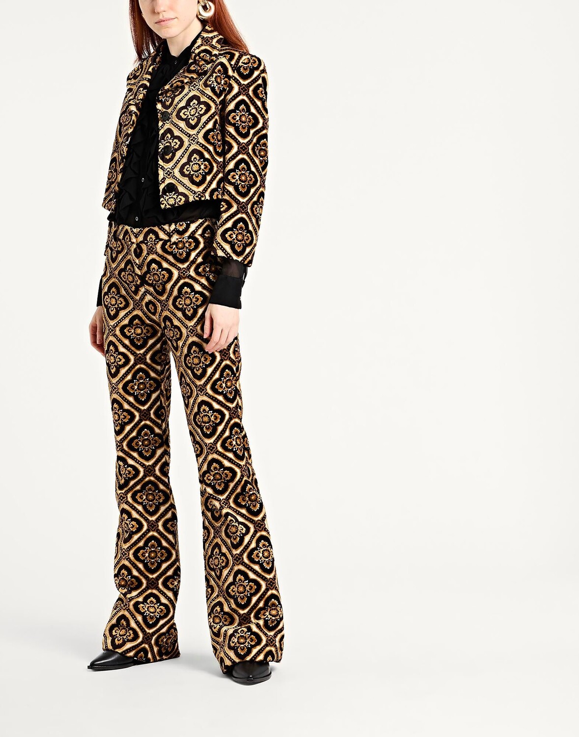 Ткань, жаккард, без аппликаций, цветочный принт, завышенная талия, классический крой, застежка-молния, застежка на крючки, множество карманов, ручная стирка или химчистка, нельзя отбеливать, нельзя сушить в стиральной машине, брюки-клеш