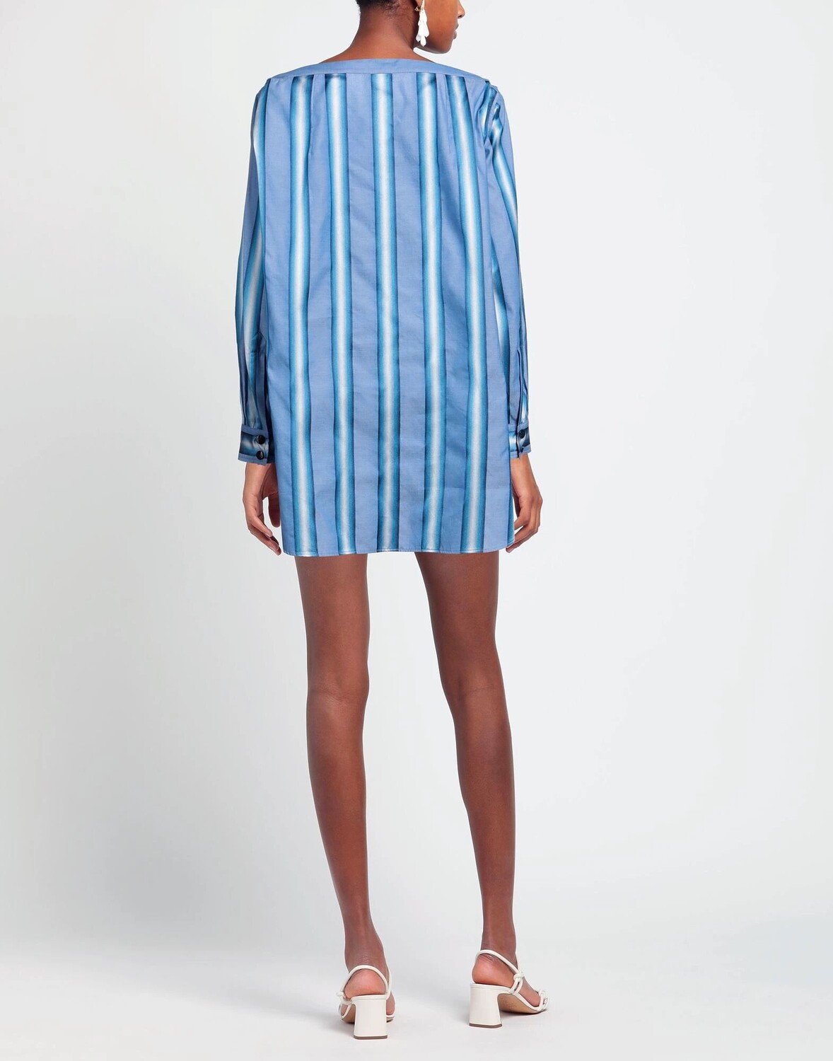 Полотняное переплетение, атлас, логотип бренда, в полоску, вырез «лодочка», длинные рукава, без подкладки, застежка на кнопки, один нагрудный карман, платье-рубашка