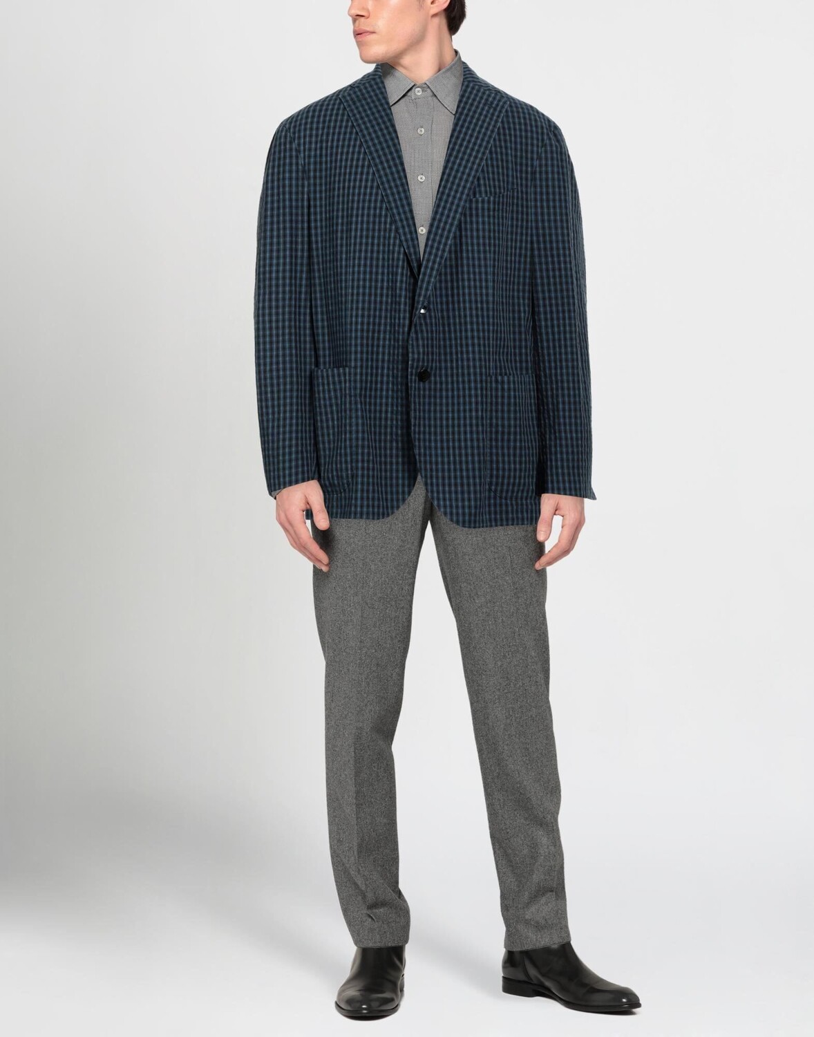 Полотняное переплетение, без аппликаций, клетка в клетку, воротник с лацканами, однобортный, длинные рукава, внутренняя часть на частичной подкладке, множество карманов, двойные шлицы сзади, стрейч, однобортный пиджак