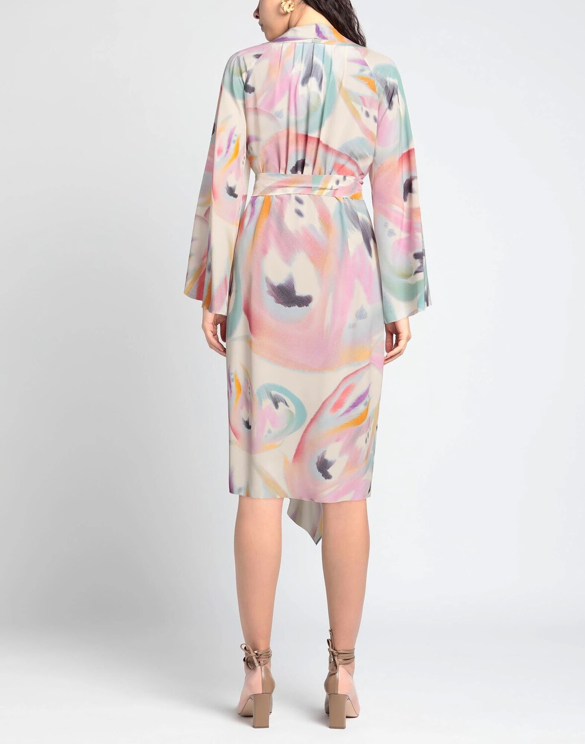 Креп, оборки, пояс, разноцветное, глубокий вырез, длинные рукава, рукава-колокол, без подкладки, кнопки, без карманов, разрез спереди, платье