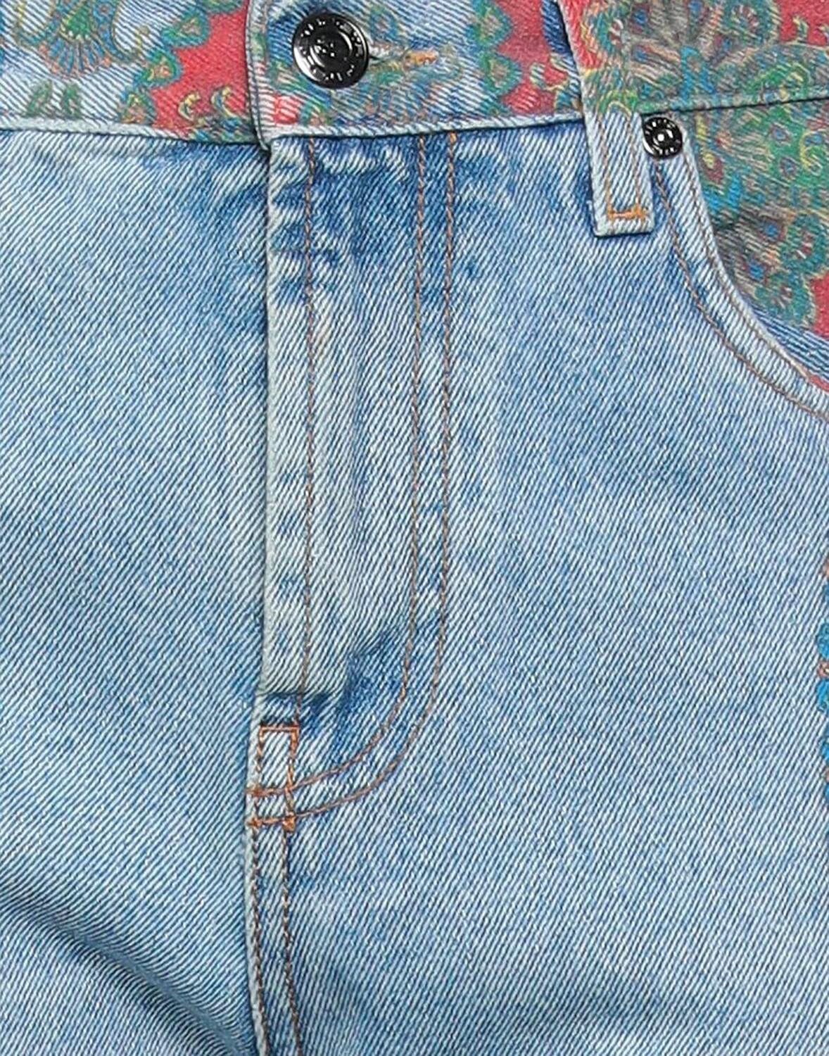 Деним, логотип бренда, принт, разноцветный рисунок, средняя степень стирки, завышенная талия, застежка-молния, 1 пуговица, множество карманов, содержит нетекстильные части животного происхождения, модель прямого кроя