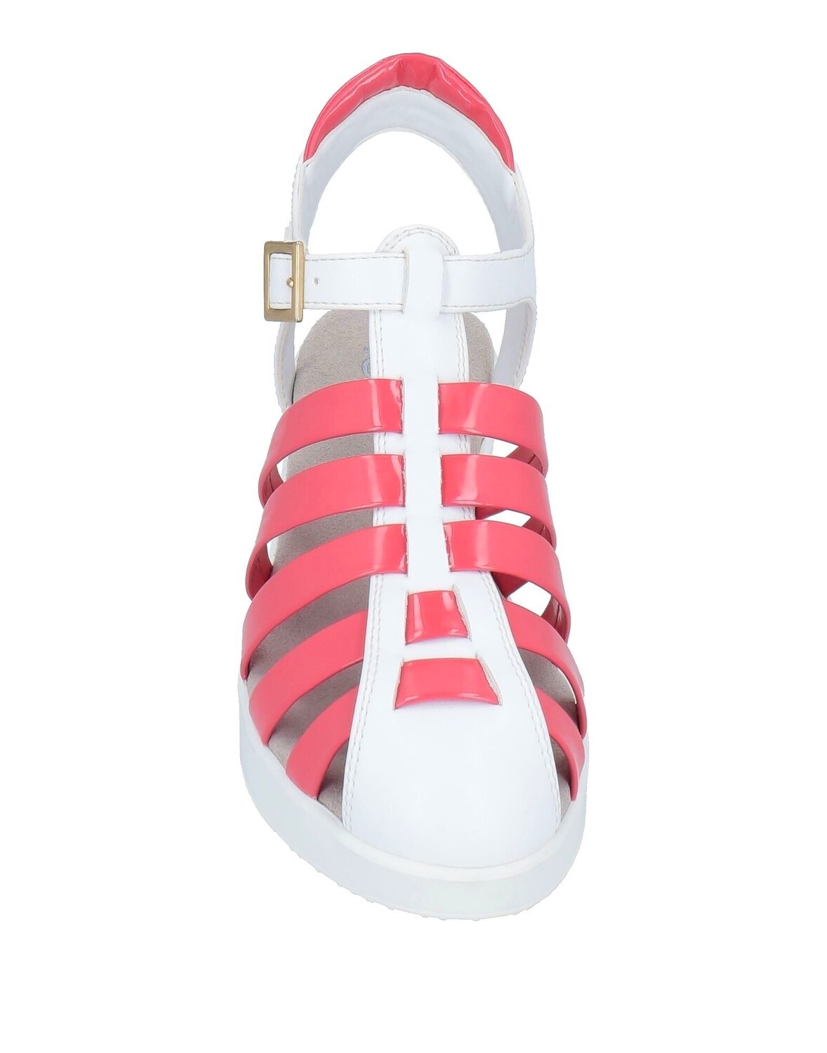 Босоножки с ремешком на щиколотке, ткань с покрытием, патент-эффект, логотип бренда, двухцветное изделие, подкладка из кожи, застежка на пряжке, круглый носок, каблук-танкетка, резиновая подошва с тиснением, содержит нетекстильные части животного происхождения