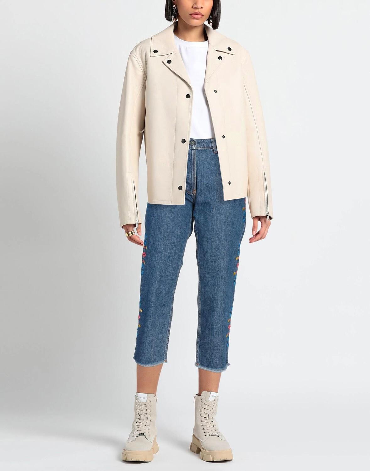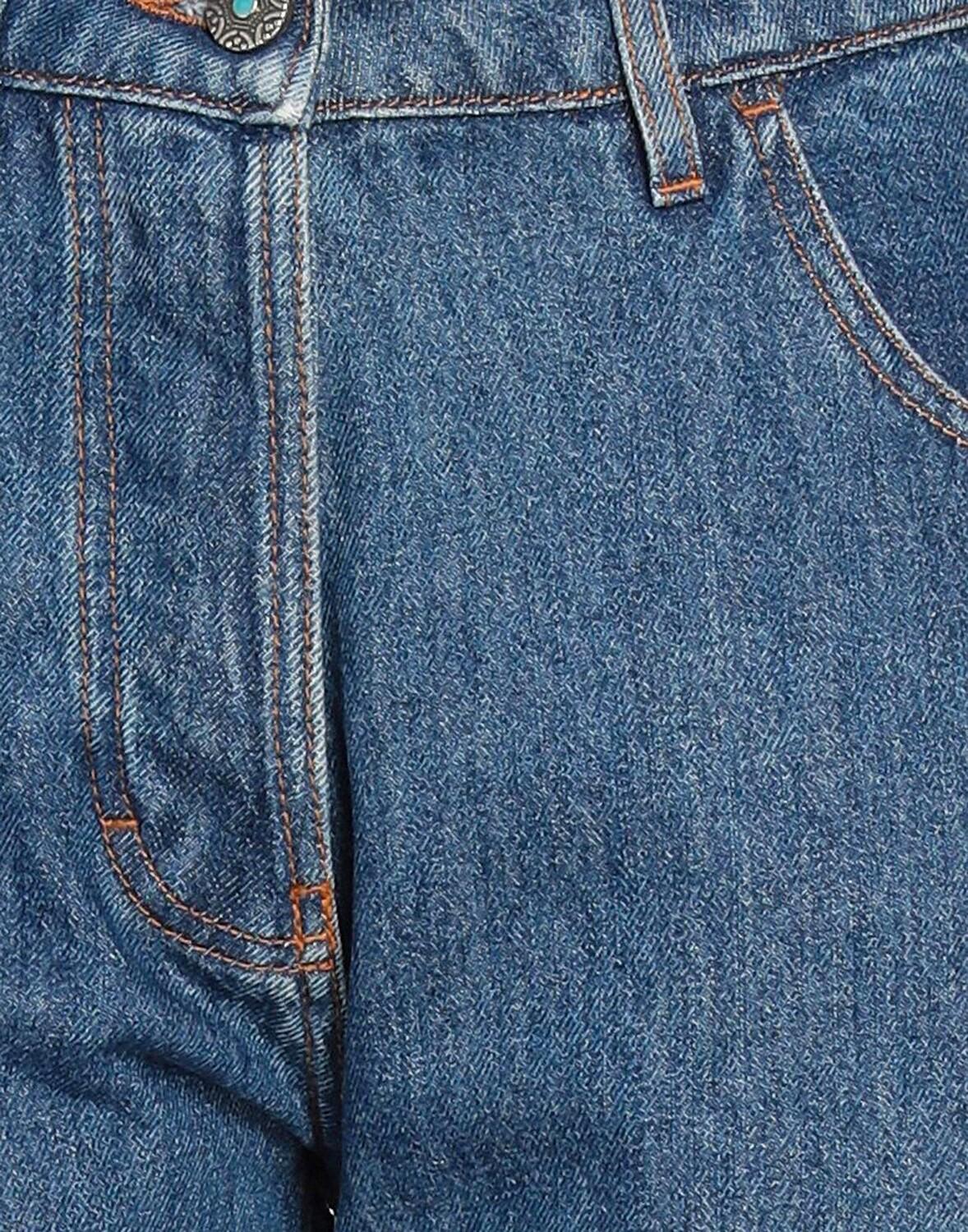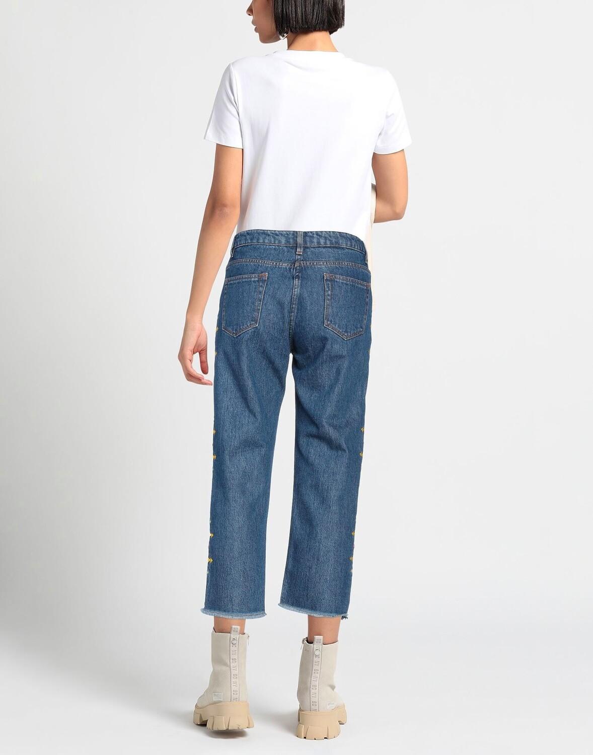 Деним, вышивка, однотонное изделие с аппликациями, средняя степень стирки, завышенная талия, зауженные брючины, стандартный крой, пуговицы, множество карманов, низ с бахромой, модель прямого кроя