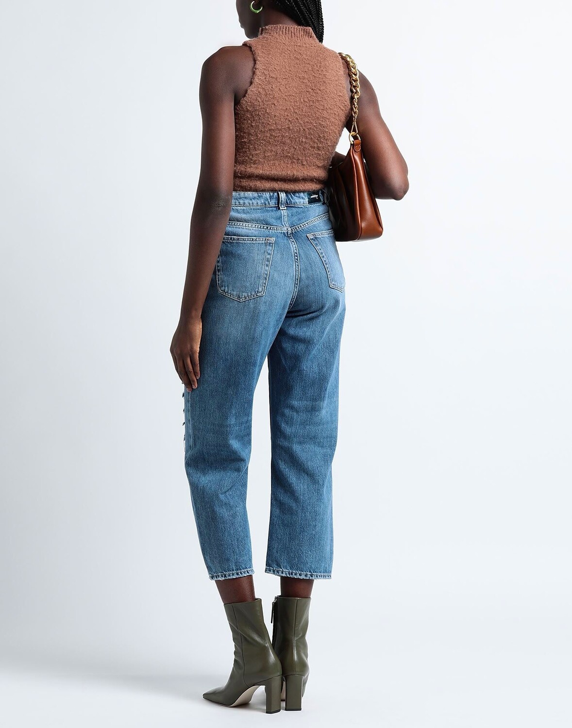 Деним, эффект потертости, выцветший, логотип бренда, одноцветное изделие, средняя степень стирки, завышенная талия, зауженные брючины, стандартный крой, 1 пуговица, застежка-молния, несколько карманов, модель мамического кроя