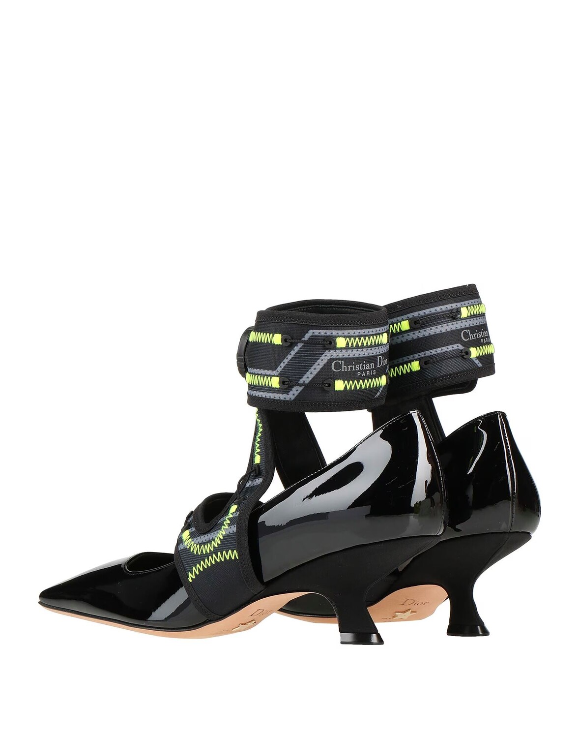 Кожа, техническая ткань, эффект лака, без аппликаций, разноцветный рисунок, кожаная подкладка, квадратный носок, каблук- катушка, кожаная подошва, содержит нетекстильные части животного происхождения, туфли с ремешком на щиколотке