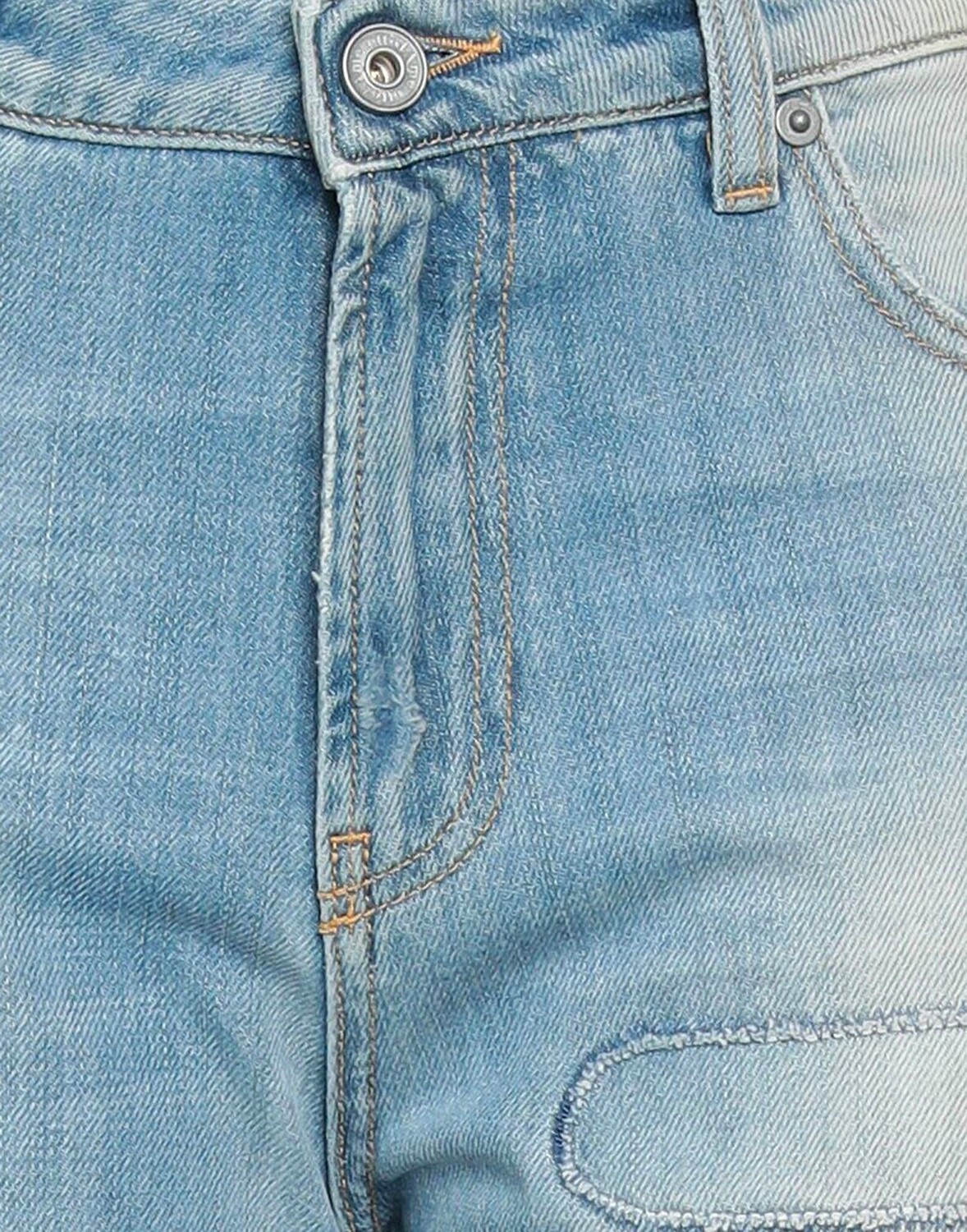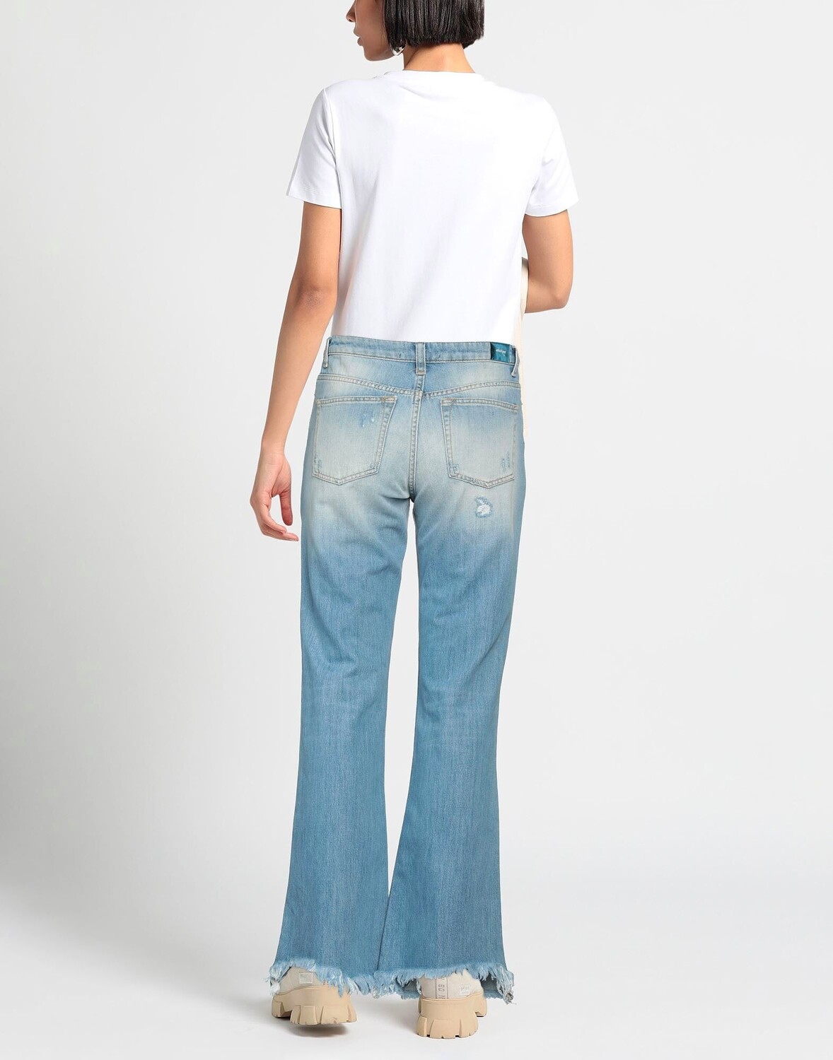 Джинсовая ткань, выцветший, эффект потертости, логотип бренда, одноцветное изделие, светлая стирка, завышенная талия, расклешенный крой, классический крой, 1 пуговица, застежка-молния, бахрома по низу, множество карманов, модель ботфортного кроя