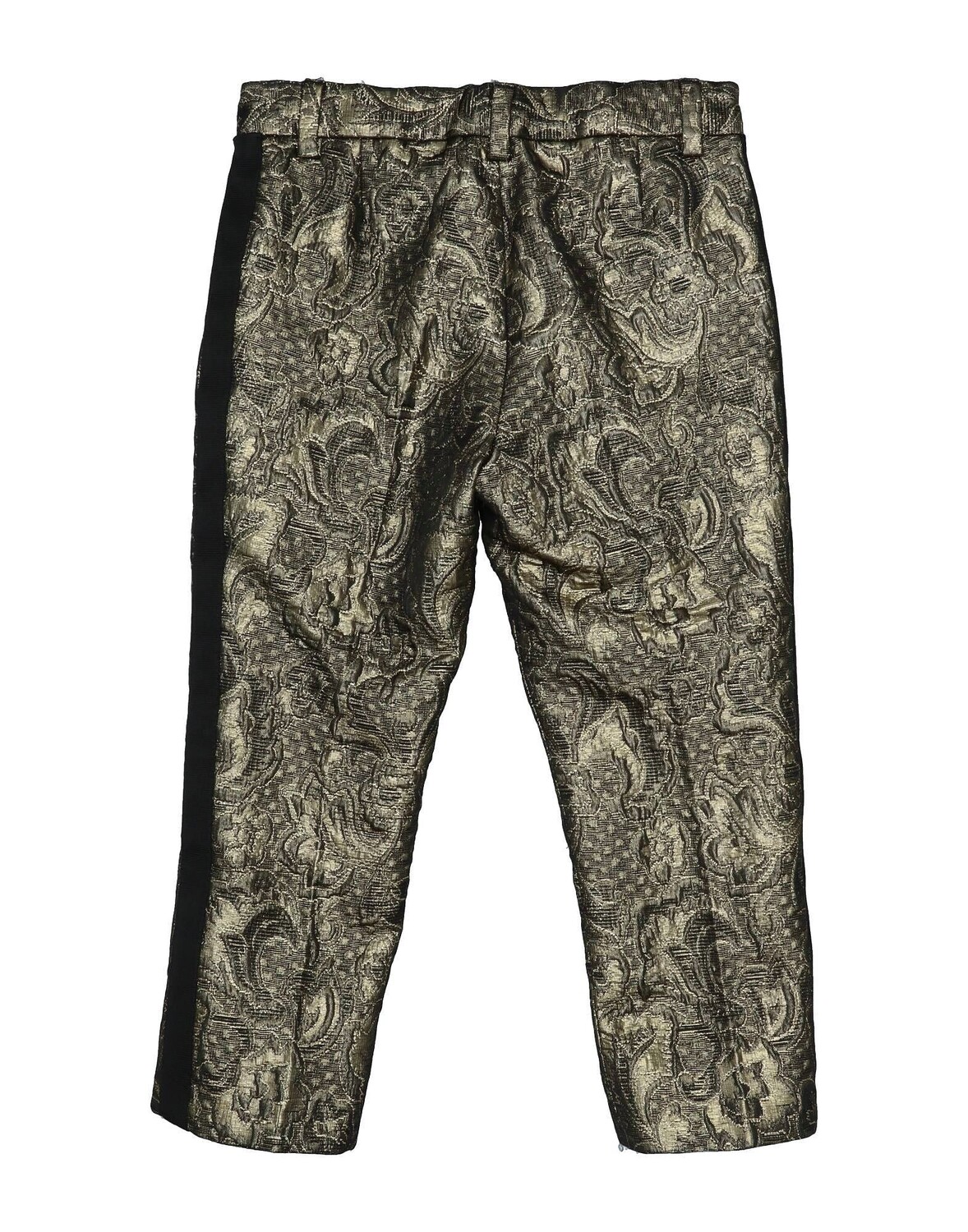 Жаккард, полотняное переплетение, ламе, полосы по бокам, средняя посадка, одноцветное изделие с аппликациями, шлевки для ремня, классический крой, прямые брючины, застежка-молния, множество карманов, на подкладке, ручная стирка, химическая чистка, нельзя гладить, не отбеливать, не сушить в сушильной машине