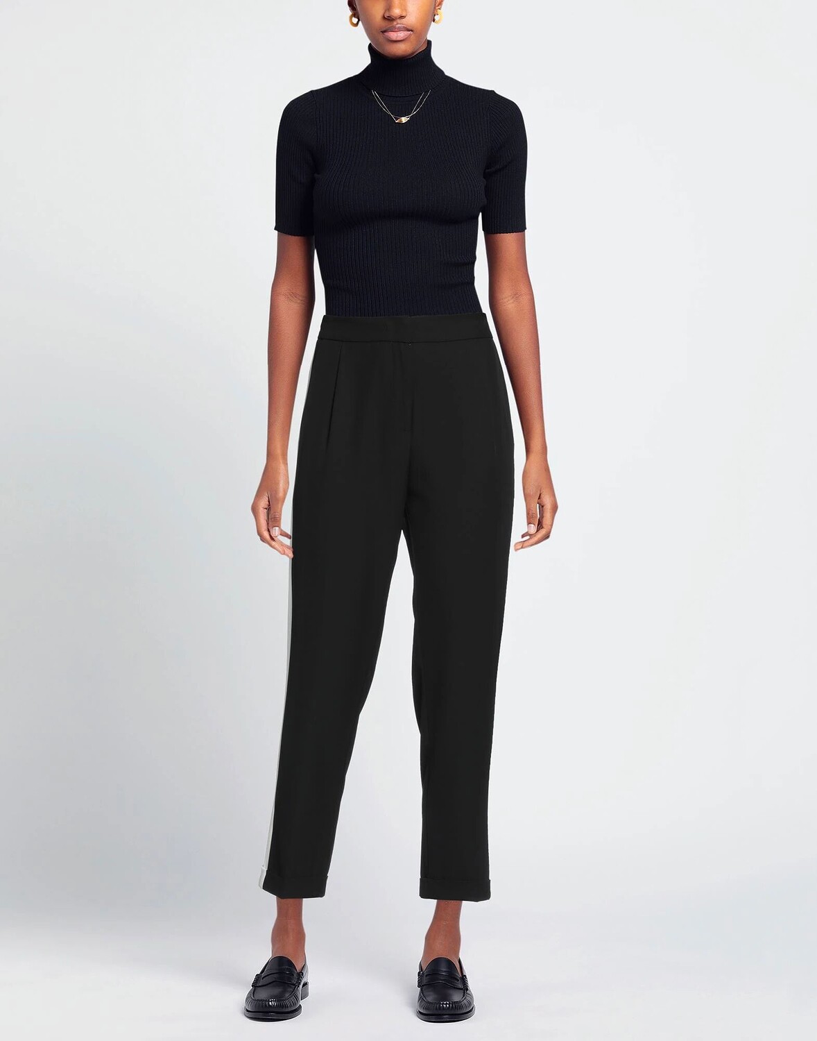 Ткань, вытачки, полоски по бокам, двухцветное изображение, завышенная талия, стандартный крой, застежка на крючки, застежка-молния, подвернутый край, множество карманов, стрейч, машинная стирка, нельзя сушить в стиральной машине, брюки прямого кроя