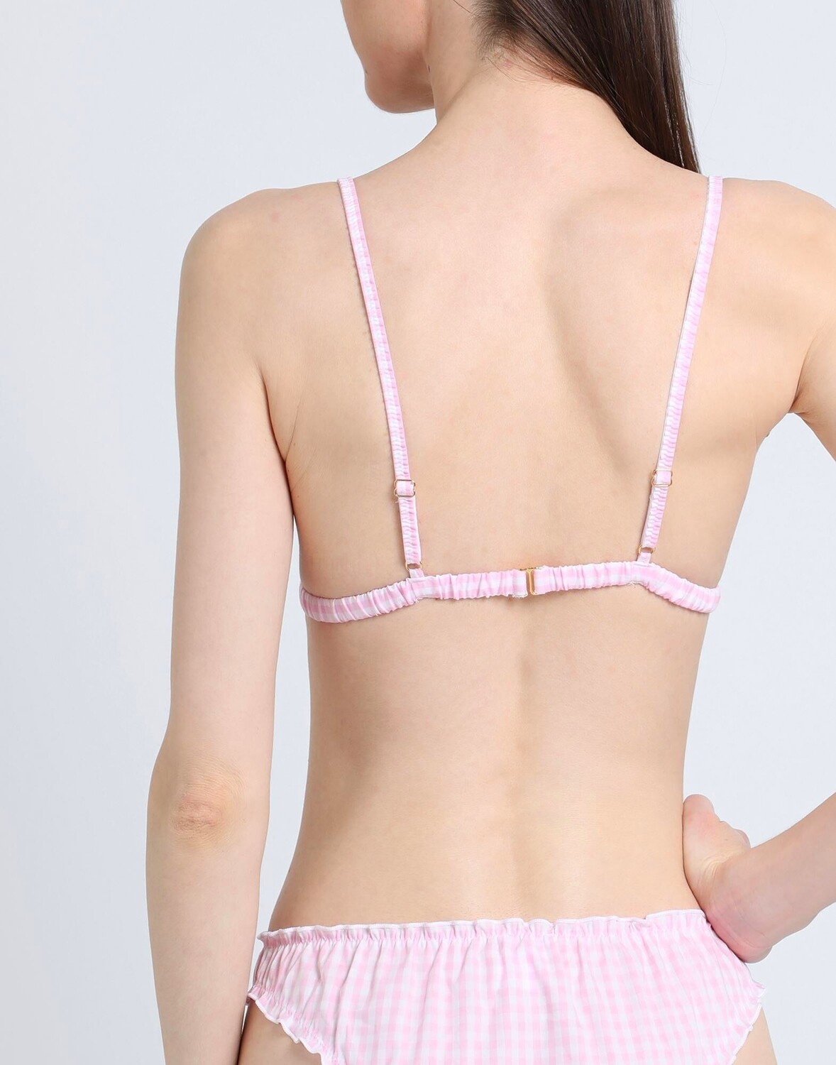 Полотняное переплетение, оборки, клетка, застежка на крючки, эластичный низ, бюстгальтер с треугольными чашками