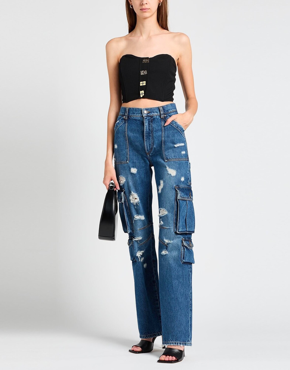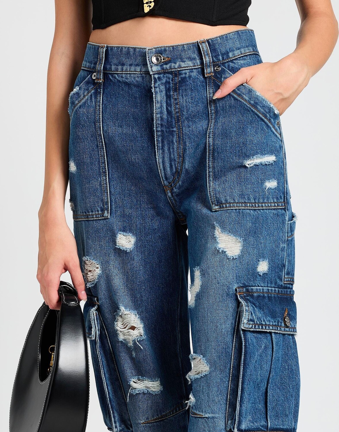 Джинсовая ткань, потертости, логотип бренда, одноцветное изделие, средняя стирка, высокая талия, шлевки для ремня, стандартный крой, застежка-молния, карманы-книжки, множество карманов, машинная стирка или химчистка, нельзя отбеливать, нельзя сушить в стиральной машине, джинсы прямого кроя