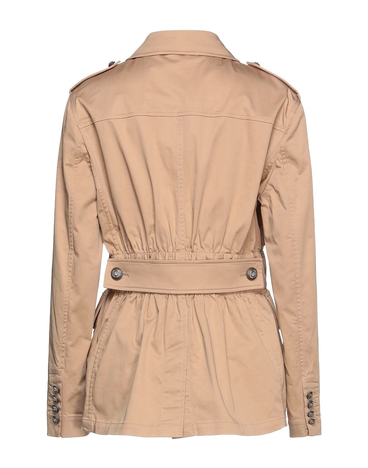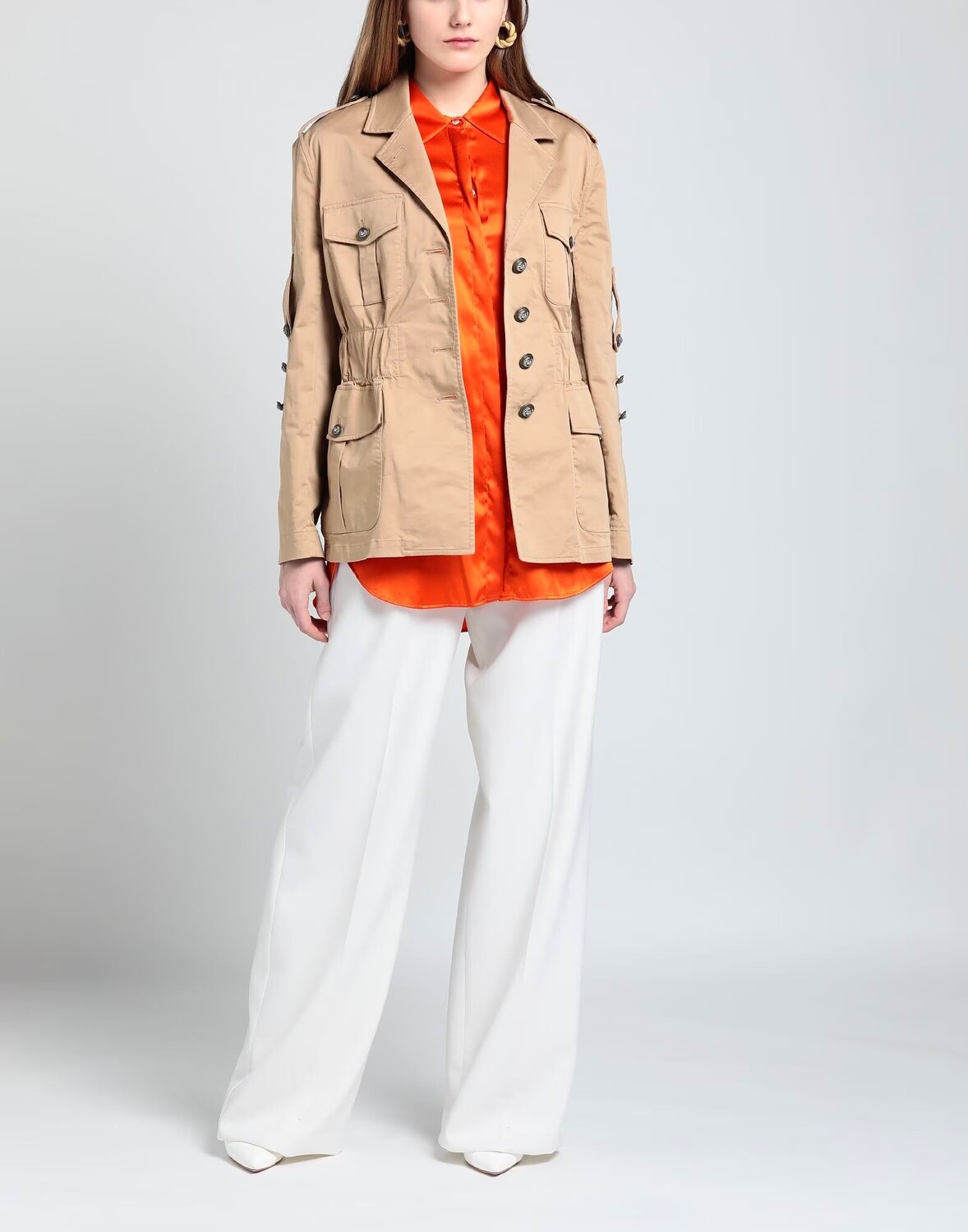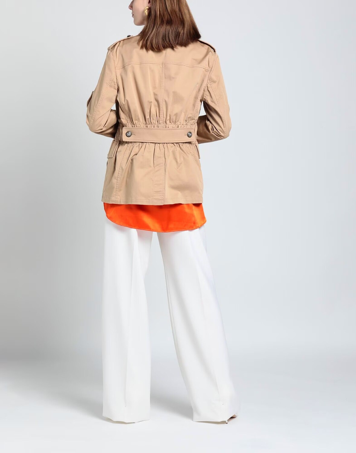 Полотняное переплетение, полупояс, вспышки, одноцветное изделие, воротник с лацканами, однобортный, длинные рукава, без подкладки, пуговицы, множество карманов, разрез сзади, стрейч