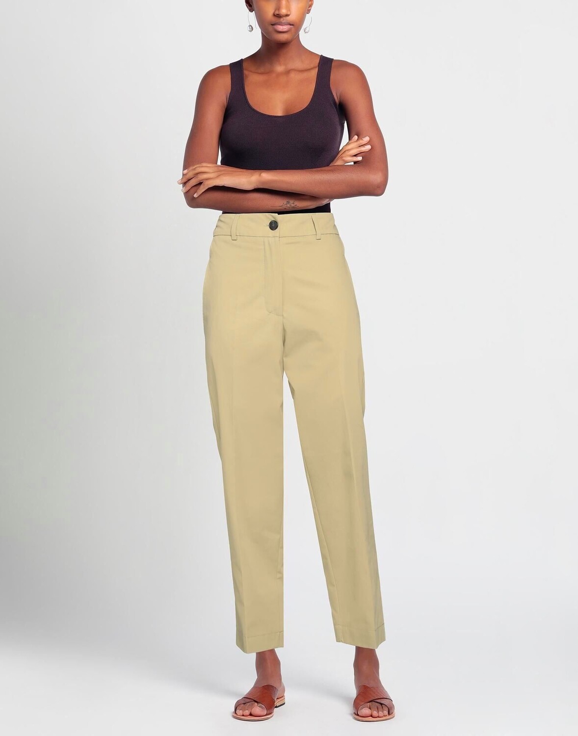 Полотняное переплетение, без аппликаций, одноцветное изделие, завышенная талия, зауженные брючины, стандартный крой, 1 пуговица, застежка-молния, множество карманов, брюки чинос