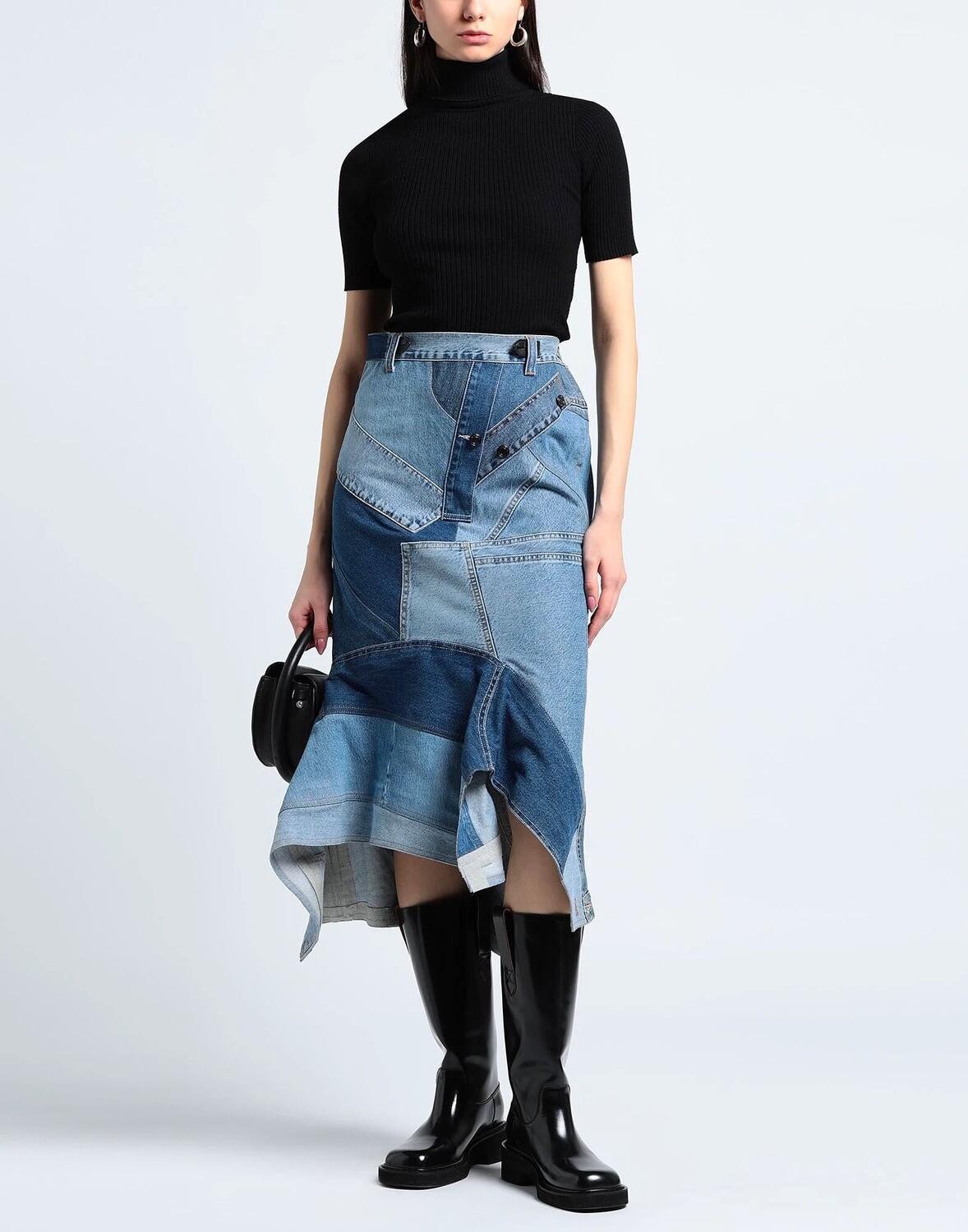 Джинсовая ткань, логотип бренда, пэчворк, средняя стирка, без подкладки, застежка-молния, 1 пуговица, без карманов, содержит нетекстильные части животного происхождения, фасон карандаш, большой размер