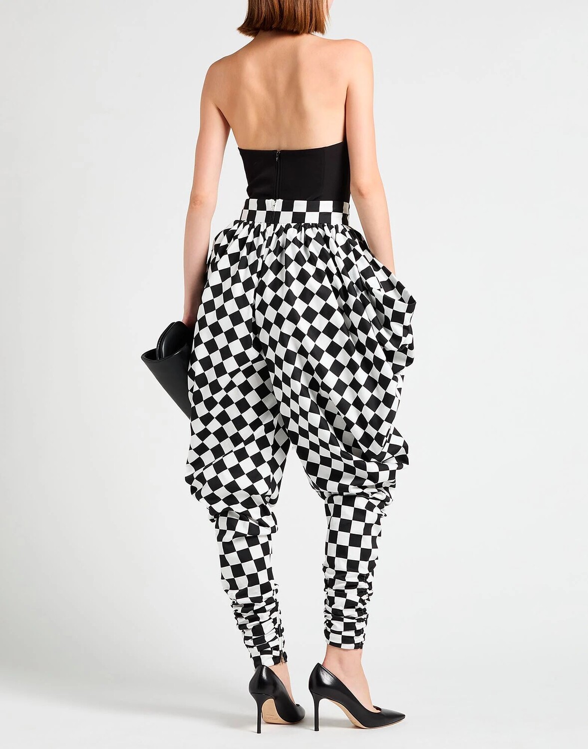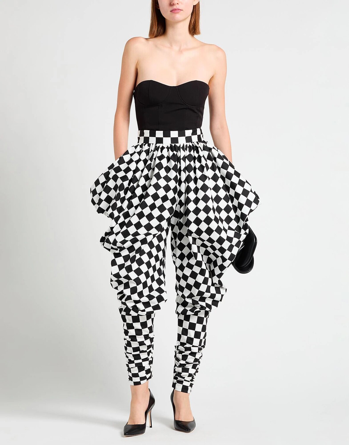 Саржа, без аппликаций, клетка в клетку, завышенная талия, стандартный крой, застежка-молния, застежка на крючки, множество карманов, стрейч, химчистка, нельзя отбеливать, нельзя сушить в стиральной машине, зауженные брюки