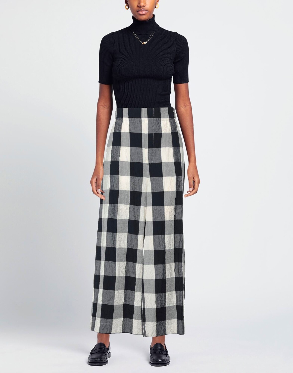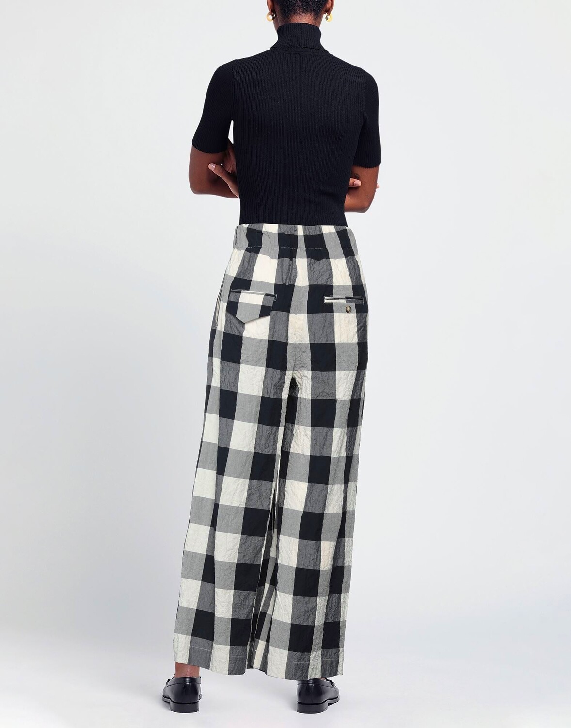 Полотняное переплетение, без аппликаций, клетка, завышенная талия, широкие штанины, стандартный крой, на резинке, множество карманов, брюки