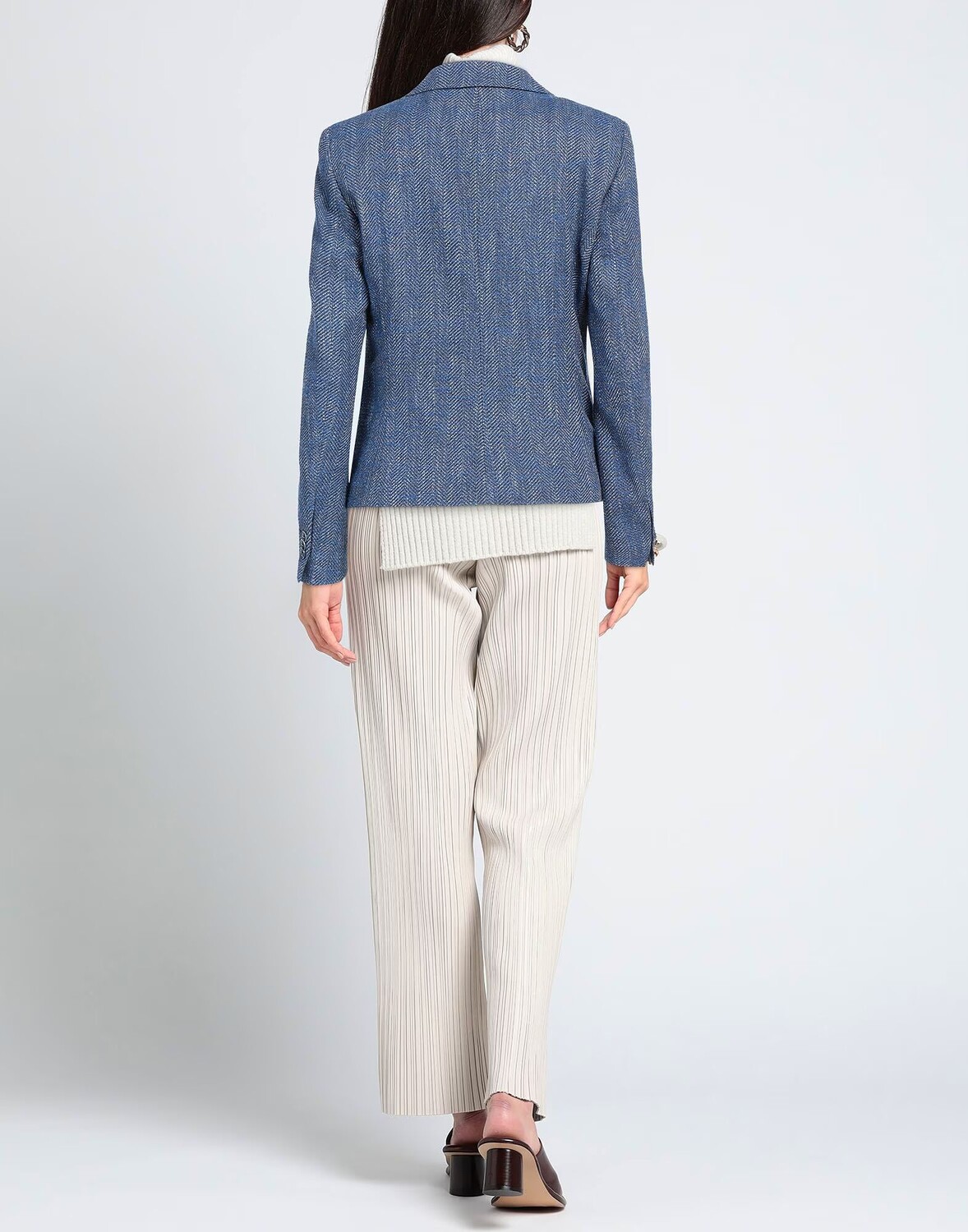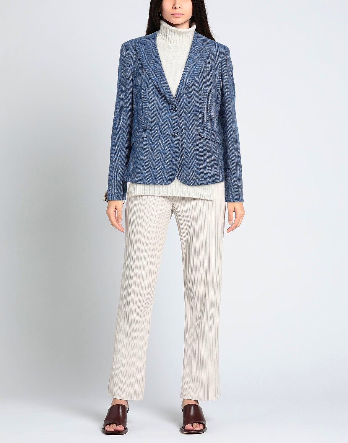 Твид, без аппликаций, узор «елочка», воротник с лацканами, длинные рукава, манжеты на пуговицах, внутри на подкладке, застежка на пуговицах, карманы с клапанами, стрейч, химчистка, не отбеливать, нельзя сушить в стиральной машине, однобортный пиджак