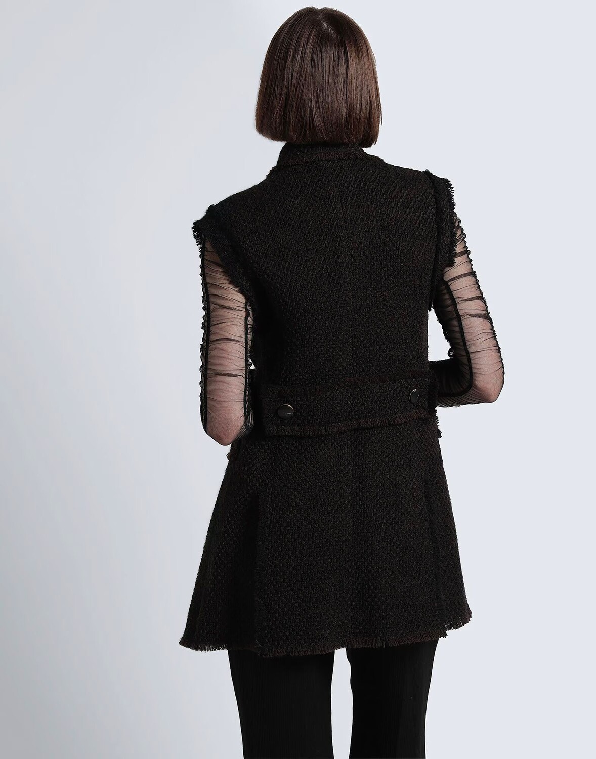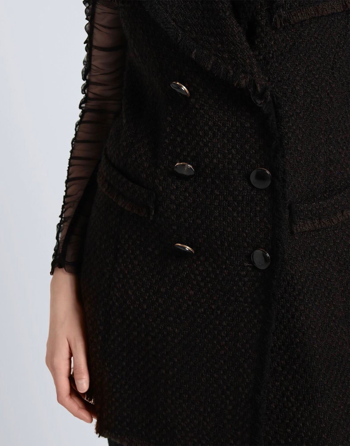 Твид, полупояс, двухцветный, воротник с лацканами, двубортный, без рукавов, без подкладки, застежка на пуговицы, двубортное пальто