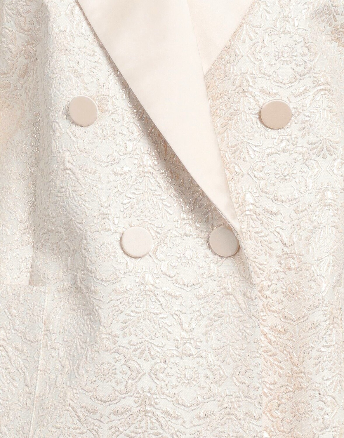 Атлас, жаккард, ламе, без аппликаций, одноцветное изделие, цветочный дизайн, воротник с лацканами, двубортный, длинные рукава, с подплечником, на подкладке, пуговицы, множество карманов, разрез сзади, стрейч, двубортный пиджак