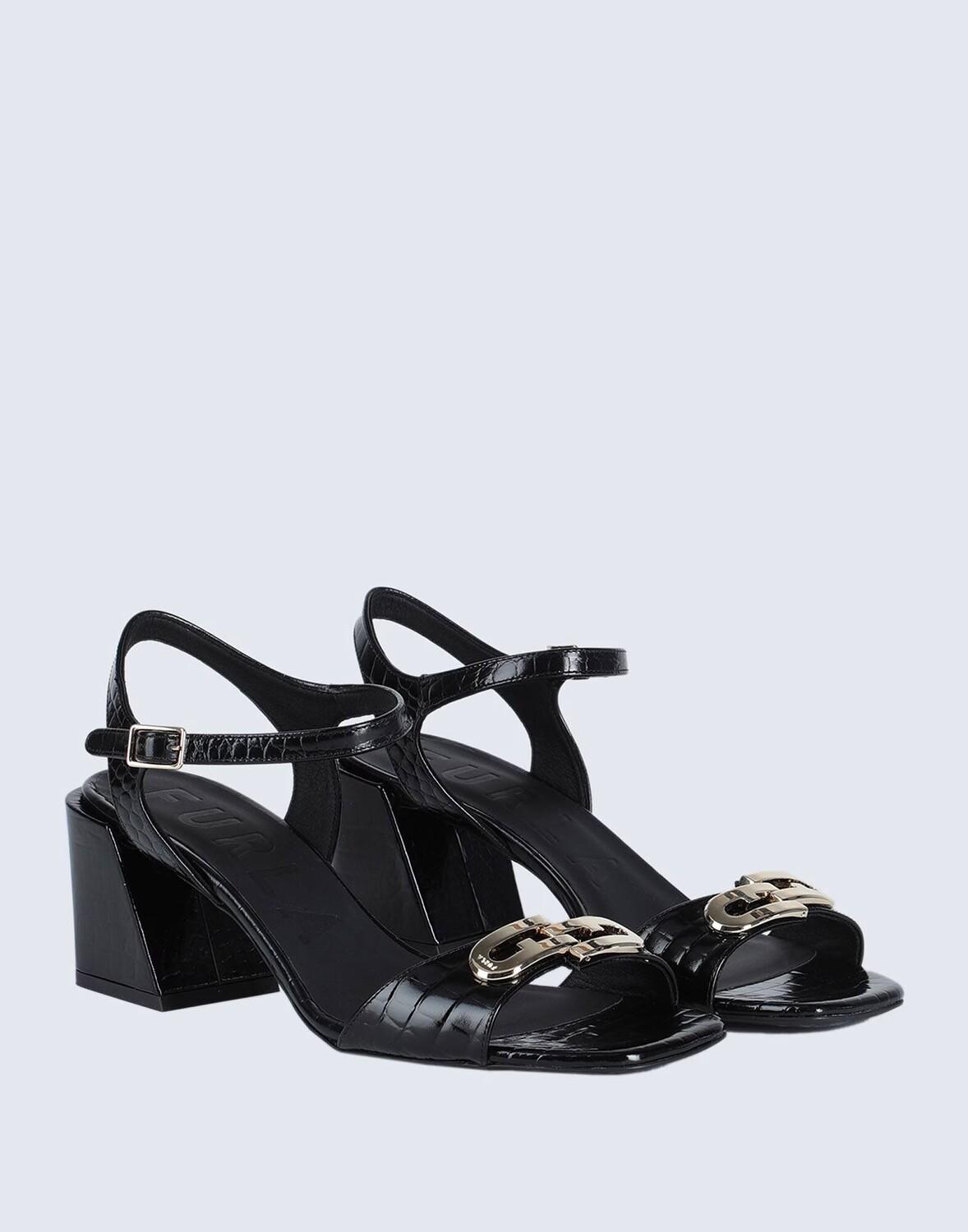 Кожа, крокодиловый принт, логотип бренда, одноцветное изделие, кожаная подкладка, ремешок с пряжкой на щиколотке, квадратный носок, квадратный каблук, обтянутый каблук, резиновая подошва, содержит нетекстильные части животного происхождения, сандалии с ремешком на щиколотке