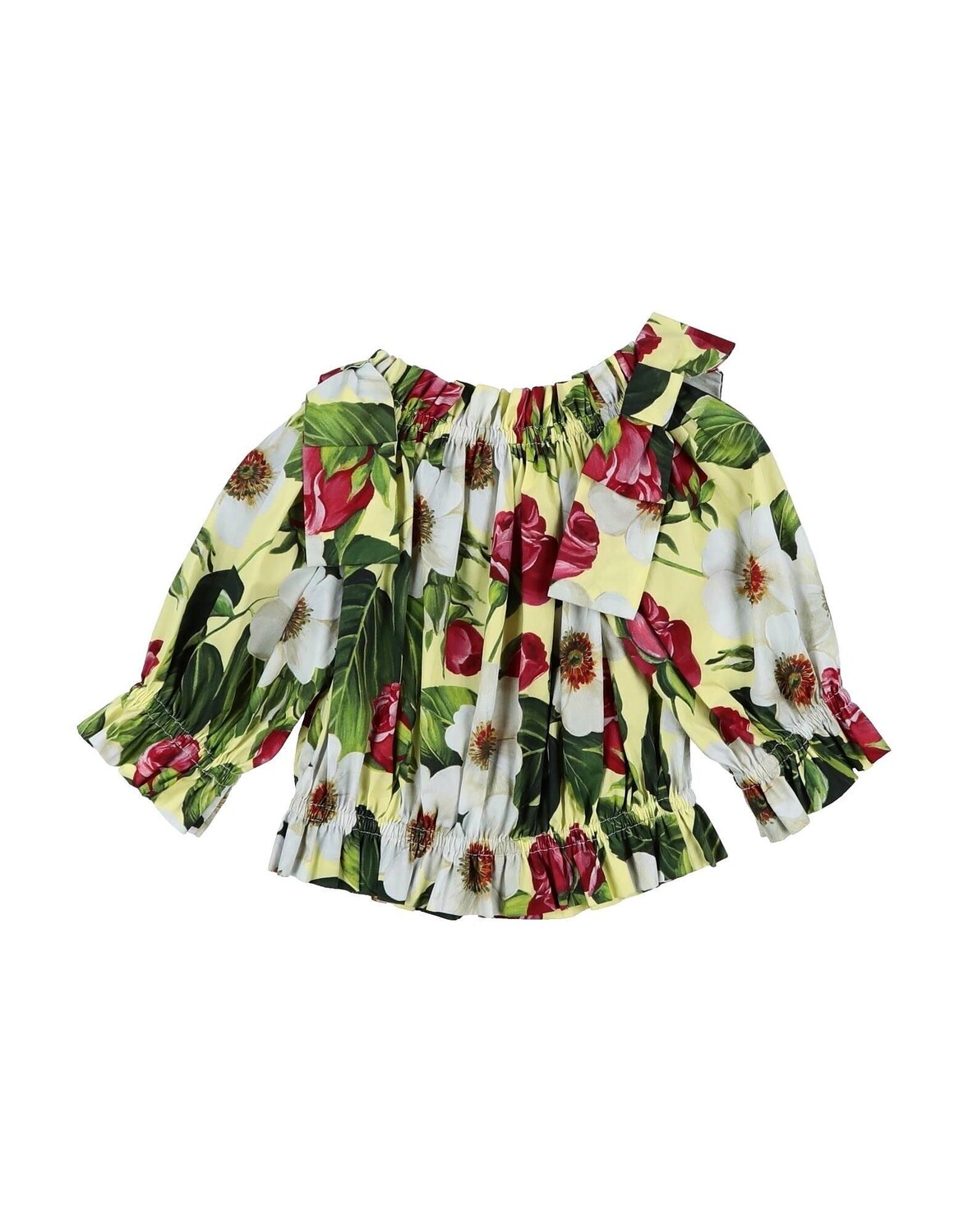 Полотняное плетение, оборки, съемная аппликация, цветочный принт, овальный вырез, длинные рукава, без карманов