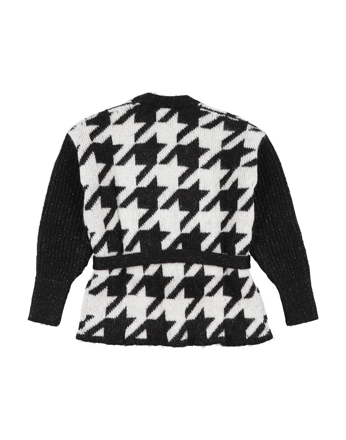 Трикотаж, ламе, пояс, «гусиные лапки», V-образный вырез, длинные рукава, пуговицы, без карманов, плотный трикотаж, ручная стирка, не подвергать химчистке, не отбеливать, не сушить в стиральной машине, гладить при температуре не выше 110°C