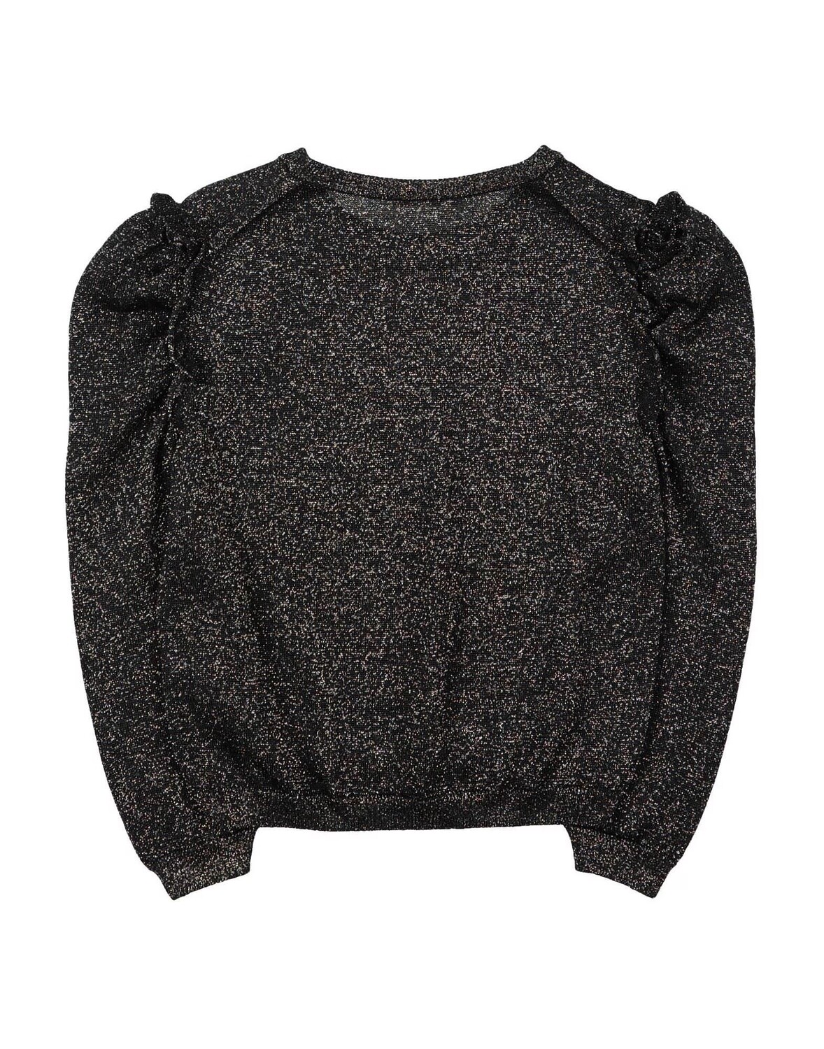 Трикотаж, ламе, длинные рукава, оборки, легкая вязка, круглый воротник, однотонное изделие с аппликациями, без карманов, без подкладки, не стирать, разрешена химическая чистка, гладить при температуре не выше 110°C, не отбеливать, нельзя сушить в стиральной машине