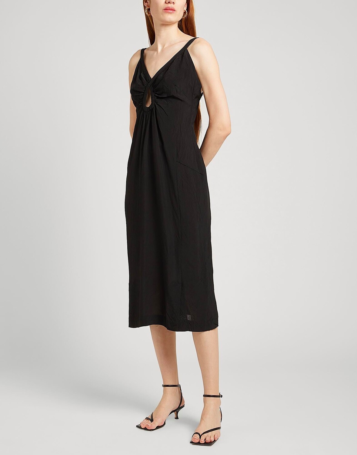Креп, без аппликаций, одноцветное изделие, глубокий вырез, без рукавов, без подкладки, застежка-молния, без карманов, разрез спереди, химчистка, нельзя сушить в стиральной машине, нельзя отбеливать, нельзя гладить, платье-комбинация