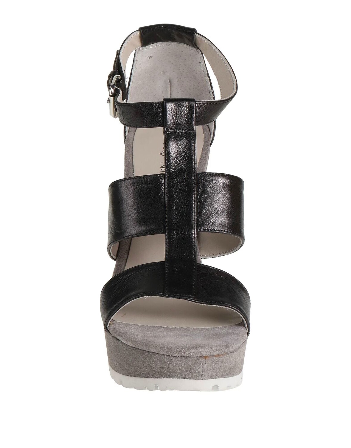 Кожа, без аппликаций, одноцветное изделие, кожаная подкладка, ремешок на щиколотке с пряжкой, скругленный носок, каблук-танкетка, покрытая танкетка, резиновая подошва с тиснением, содержит нетекстильные части животного происхождения, сандалии с ремешком на щиколотке