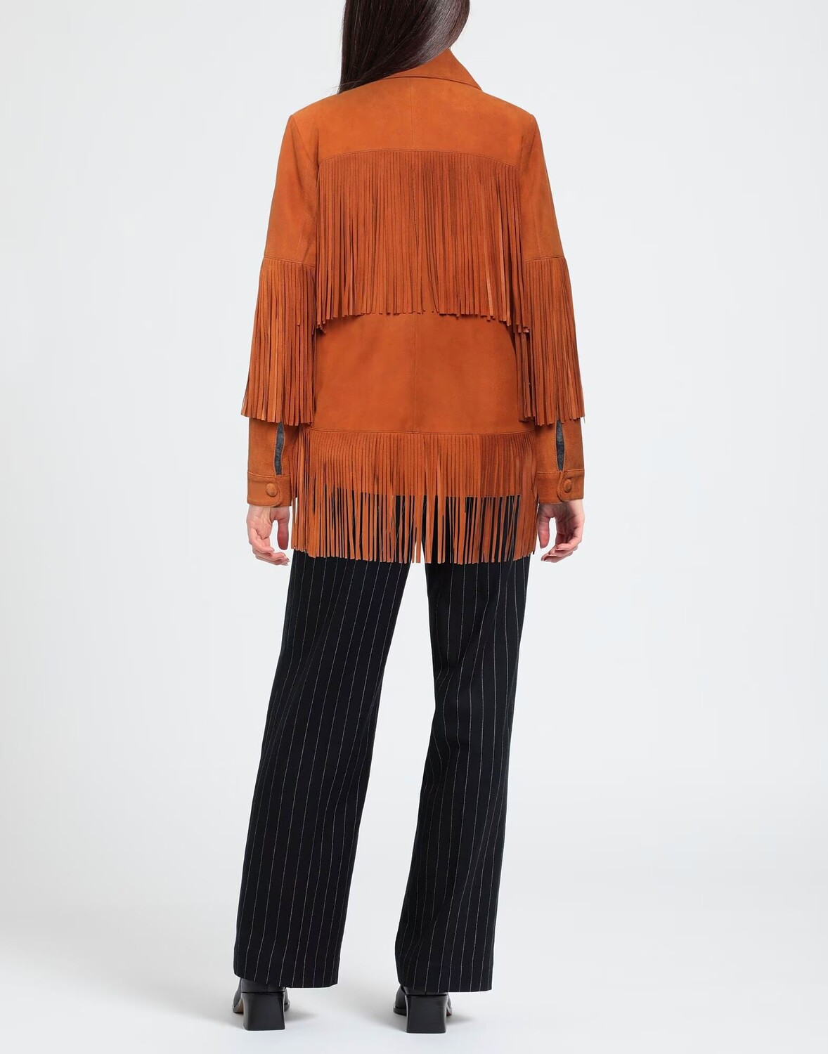 Замша, бахрома, одноцветное изделие, классический воротник, однобортный, длинные рукава, полностью на подкладке, застежка на пуговицы, множество карманов, содержит нетекстильные части животного происхождения, повседневная куртка