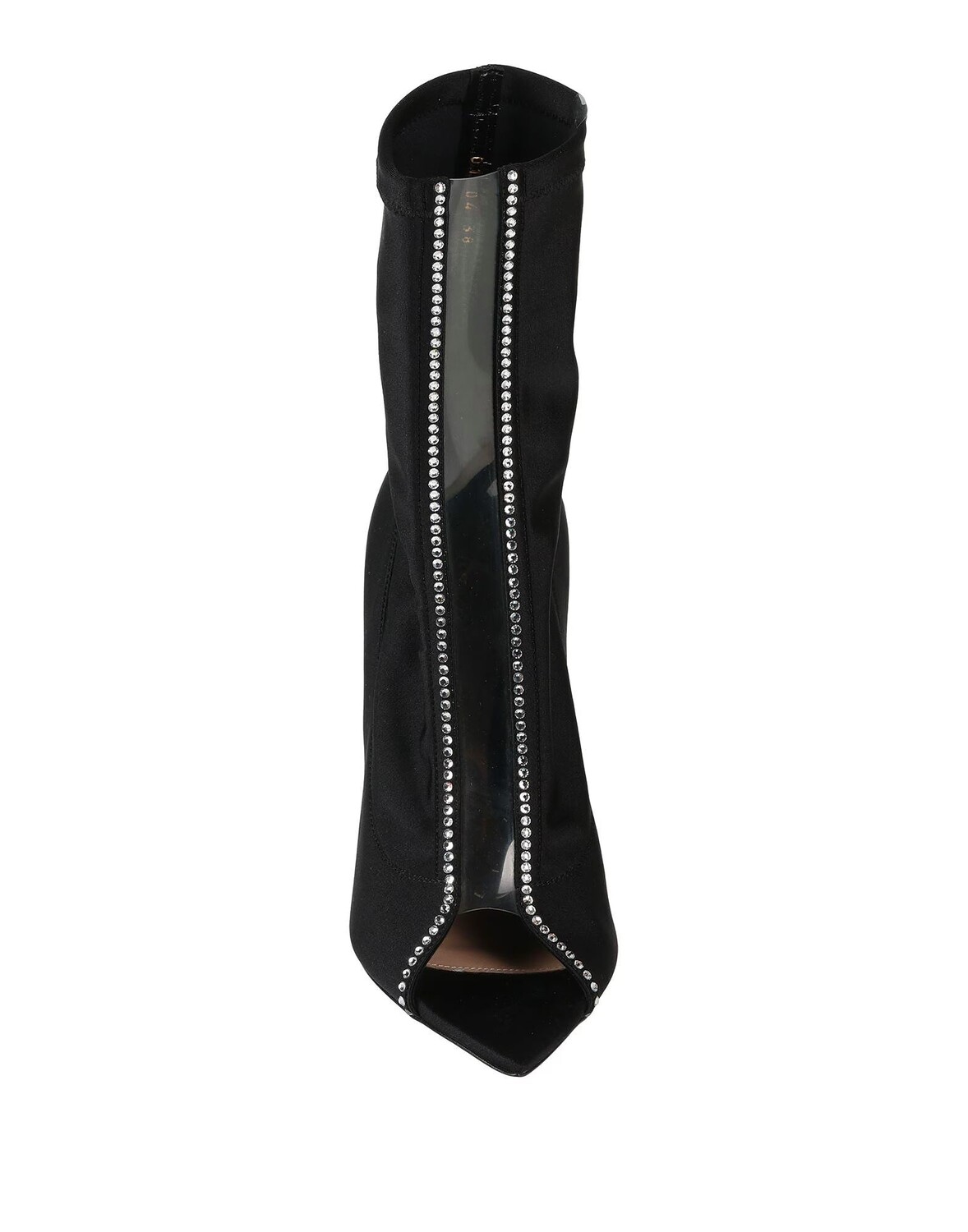 Трикотаж, пластик, прозрачный эффект, стразы, разноцветный узор, кожаная подкладка, открытый носок, шпилька, кожаная подошва, содержит нетекстильные части животного происхождения, ботинки-носки