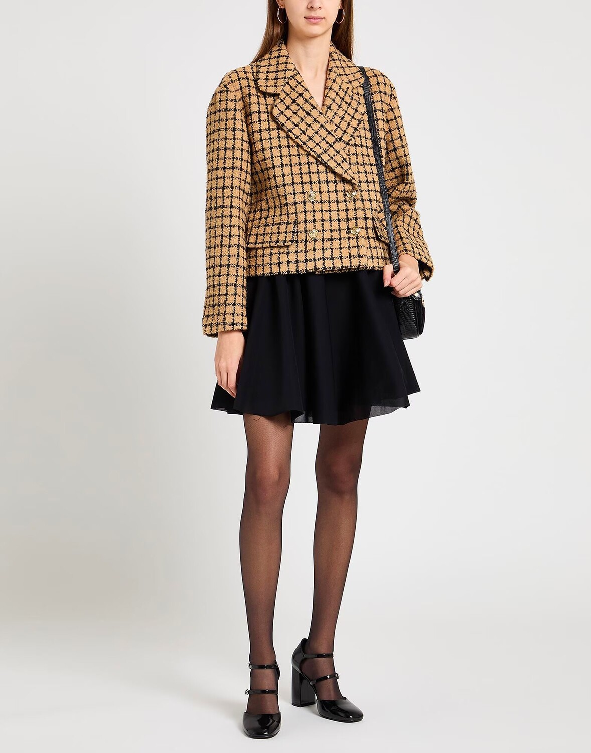 Двубортный пиджак, букле, без аппликаций, в клетку, воротник с лацканами, длинные рукава, на подкладке, застежка на пуговицы, множество карманов, химчистка, нельзя отбеливать, нельзя сушить в стиральной машине