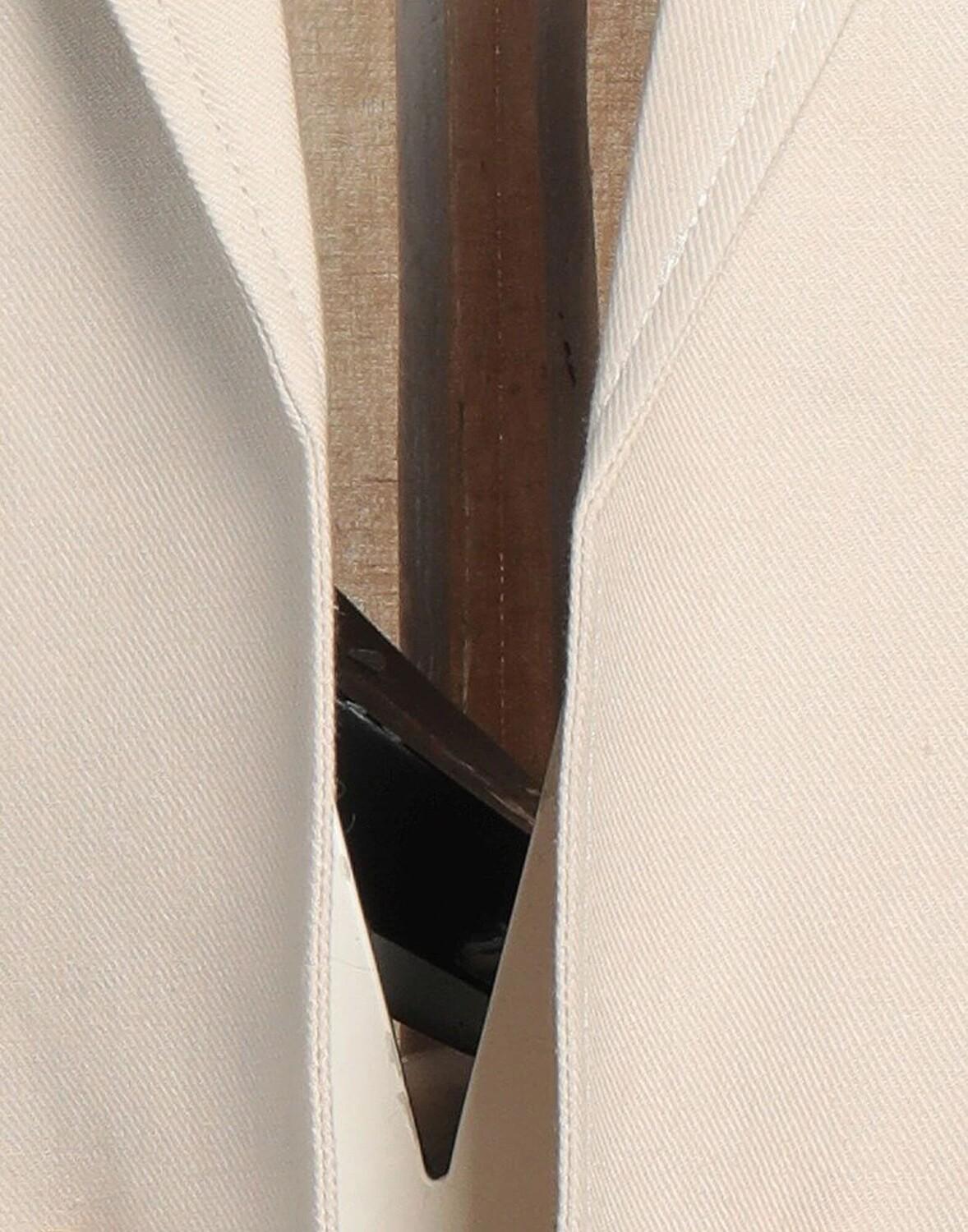 Полотняное переплетение, без аппликаций, одноцветное изделие, воротник с лацканами, двубортный, длинные рукава, без подкладки, пуговицы, множество карманов, двубортный пиджак