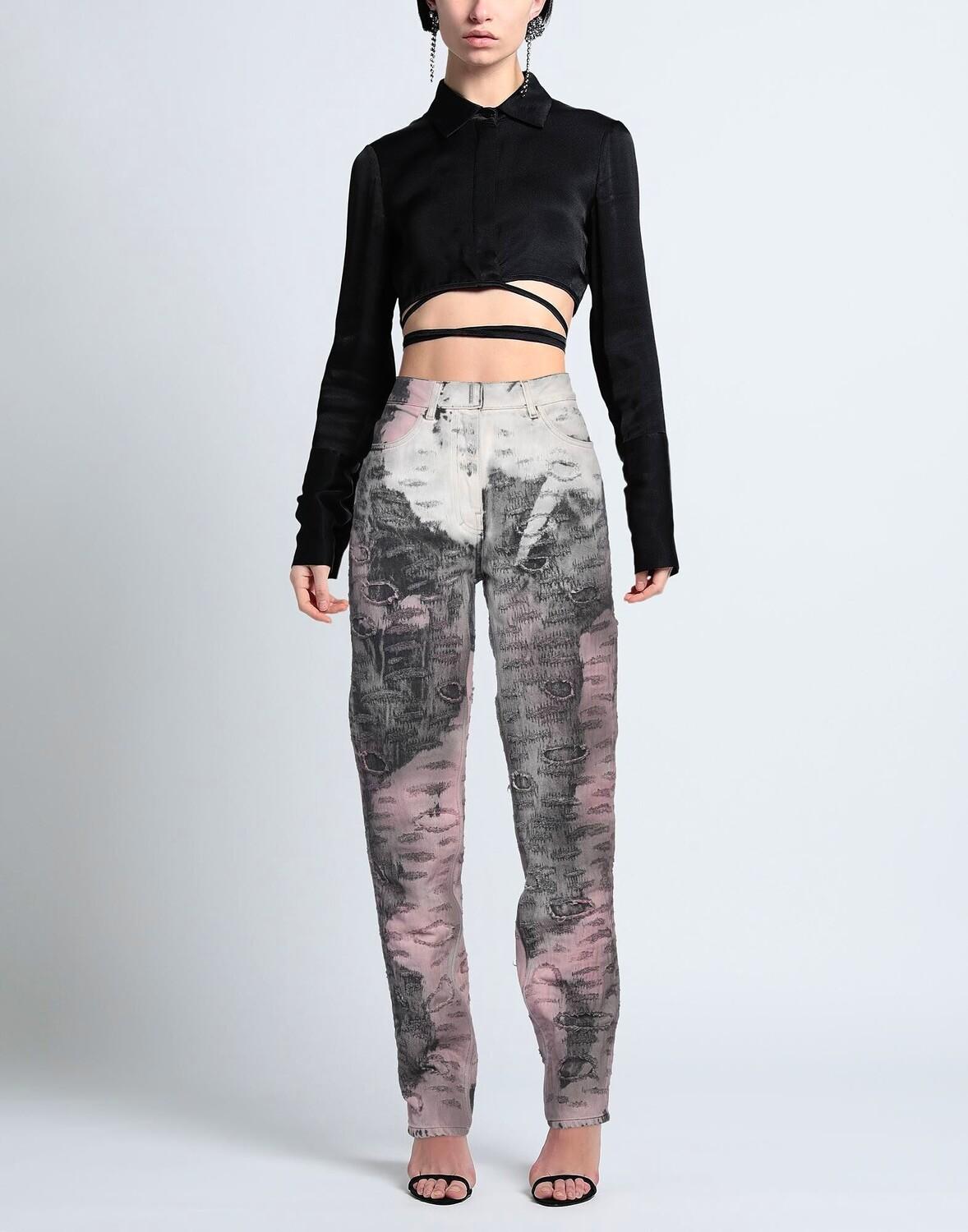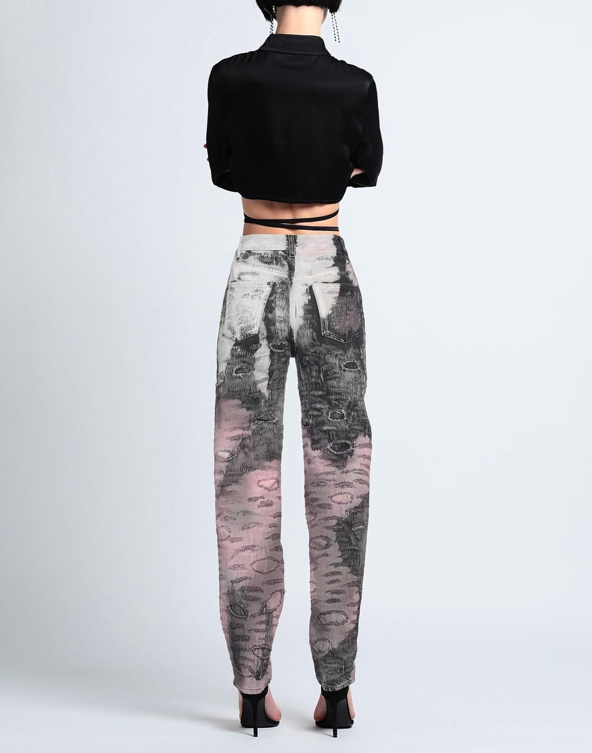 Джинсовая ткань, потертости, логотип бренда, многоцветный, цветная стирка, завышенная талия, застежка-молния, застежки-крючки, множество карманов, машинная стирка или химчистка, нельзя сушить в стиральной машине, не отбеливать, джинсы прямого кроя