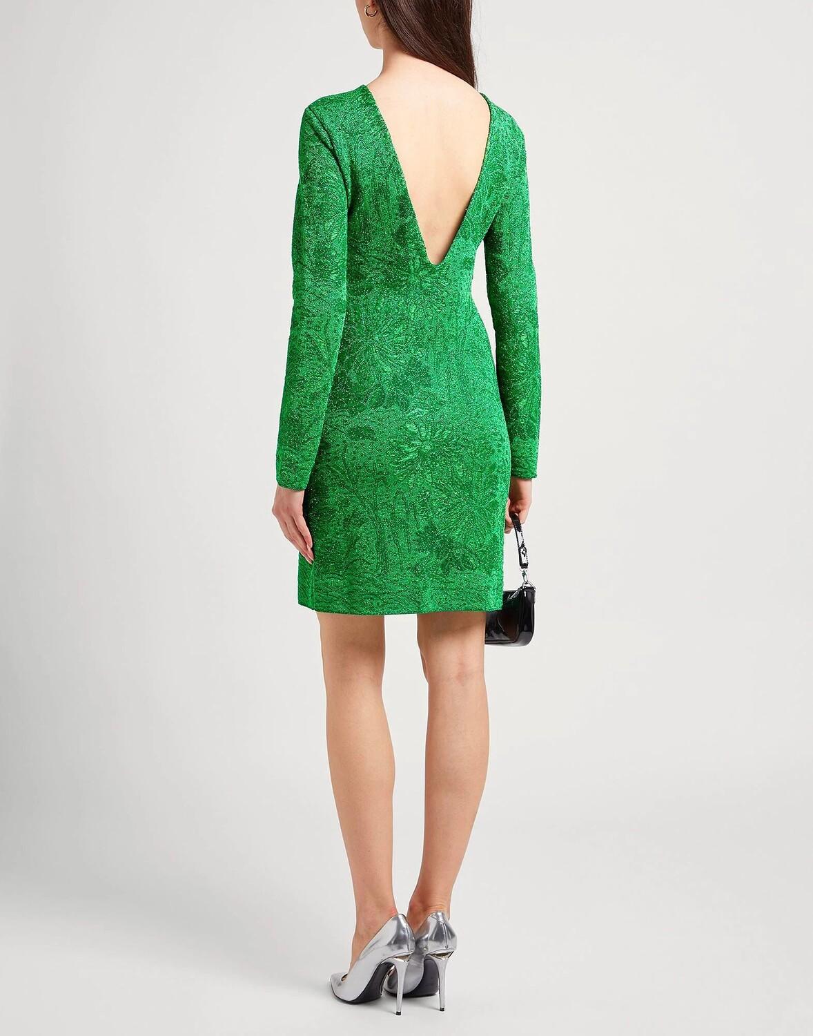 Вязаное, ламе, легкий трикотаж, открытая спина, одноцветное изделие, круглый вырез горловины, длинные рукава, внутри на подкладке, застежка-молния, без карманов, химчистка, нельзя отбеливать, нельзя сушить в стиральной машине, облегающее платье