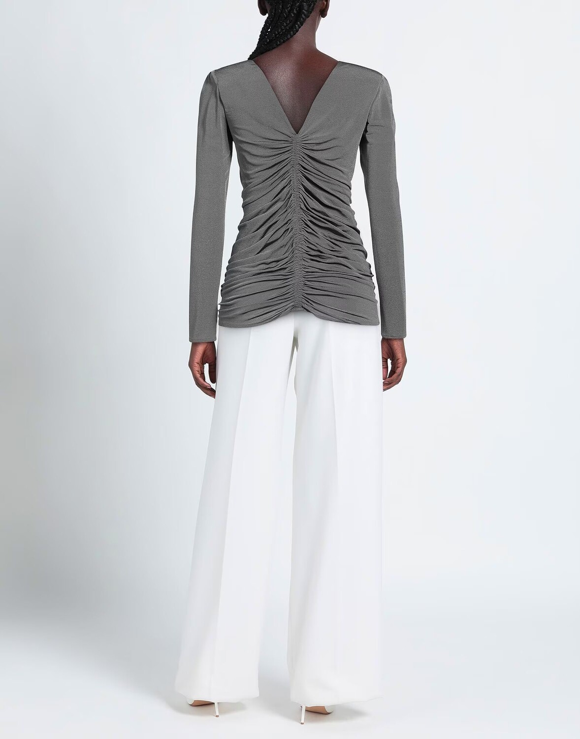 Атлас, присборенный, однотонный, глубокий вырез, длинные рукава, с подплечниками, без карманов, стрейч, верх