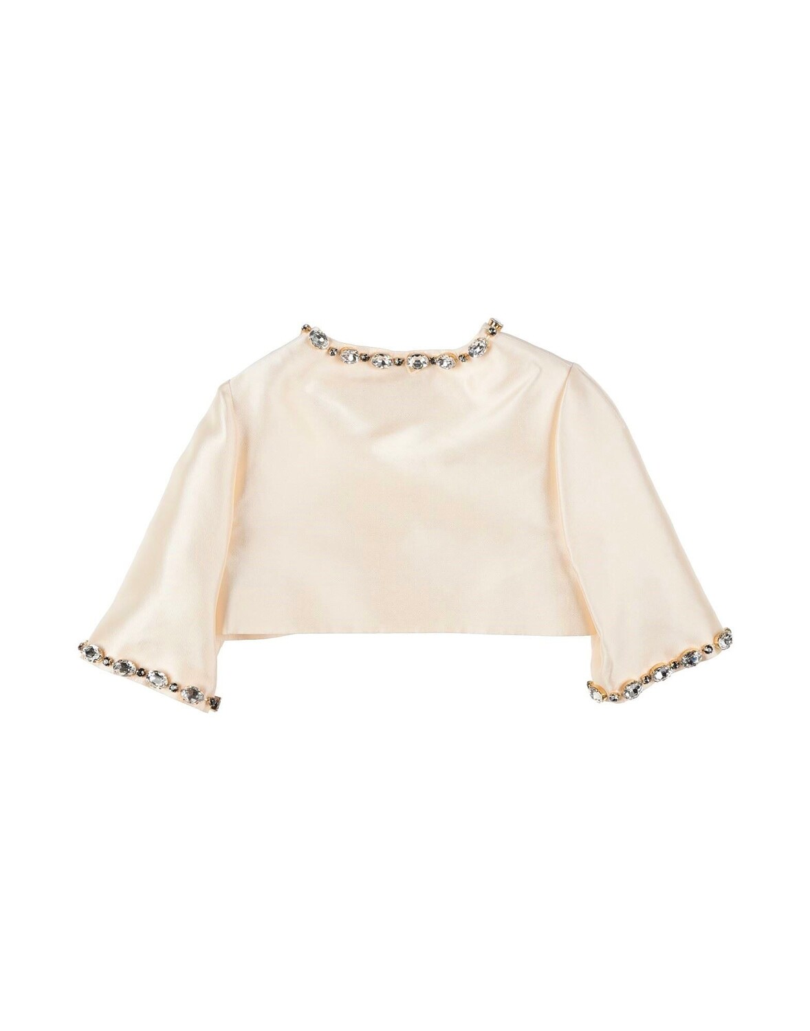 Атлас, кристаллы, однотонное изделие с аппликациями, круглый вырез, однобортный, рукава 3/4, на подкладке, застежка на крючки, без карманов, нельзя стирать, не отбеливать, не сушить в стиральной машине.