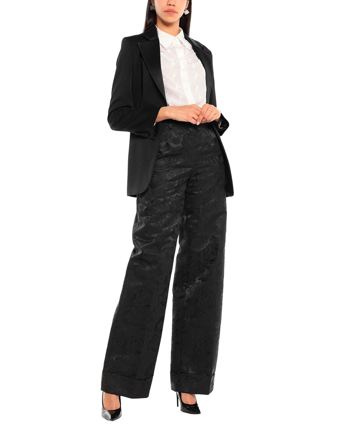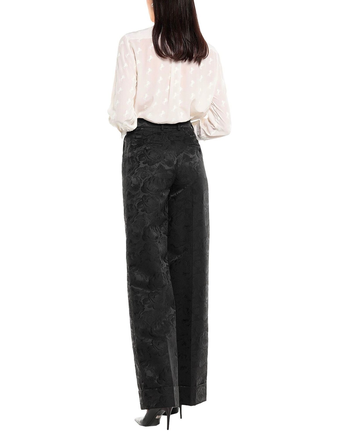 Жаккард, полотняное переплетение, цветочный дизайн, без аппликаций, завышенная талия, классический крой, широкие брючины, пуговица, молния, множество карманов, манжеты по краю