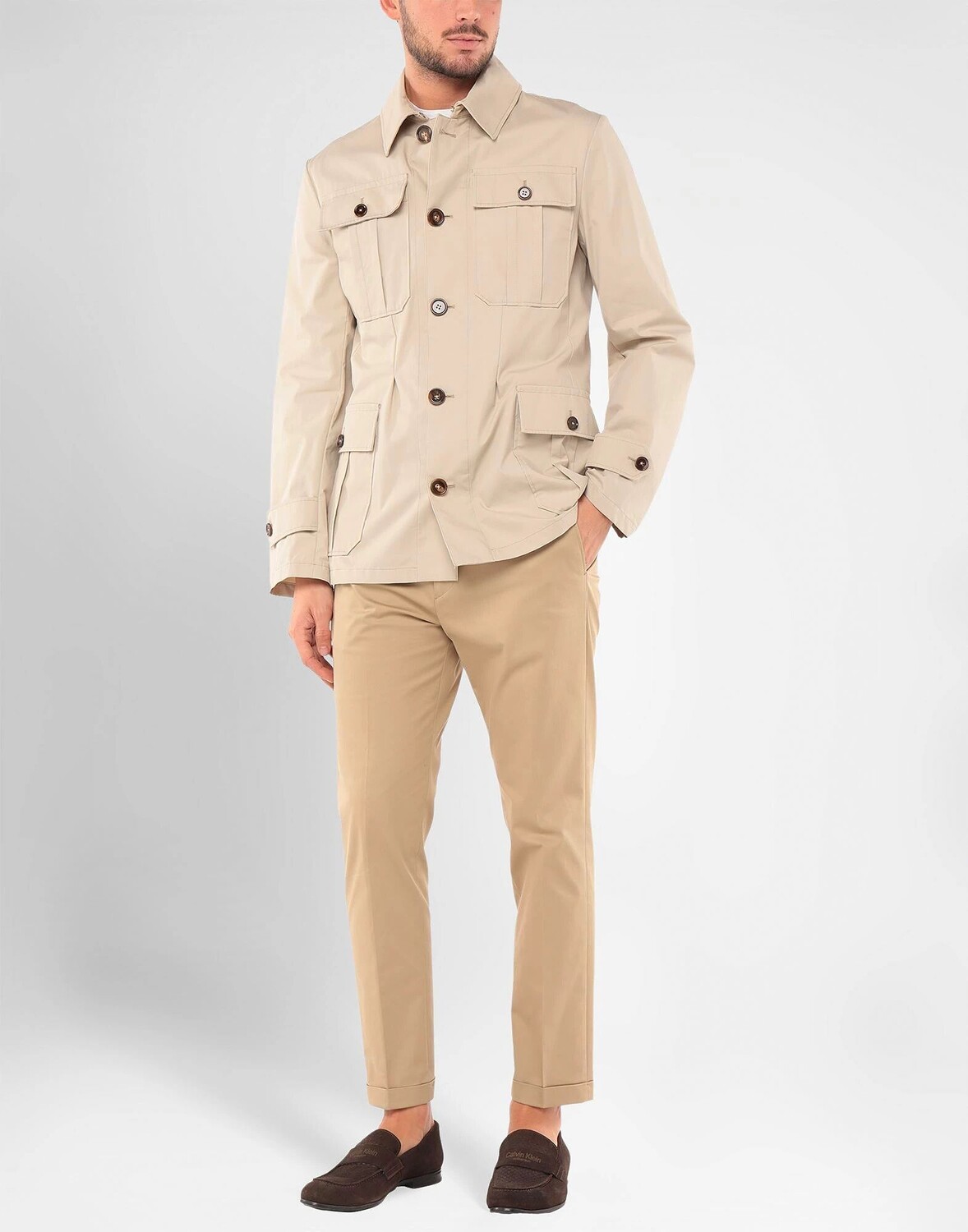 Полотняное переплетение, без аппликаций, однотонное изделие, однобортное, застежка на пуговицы, классический вырез горловины, множество карманов, длинные рукава, без подкладки