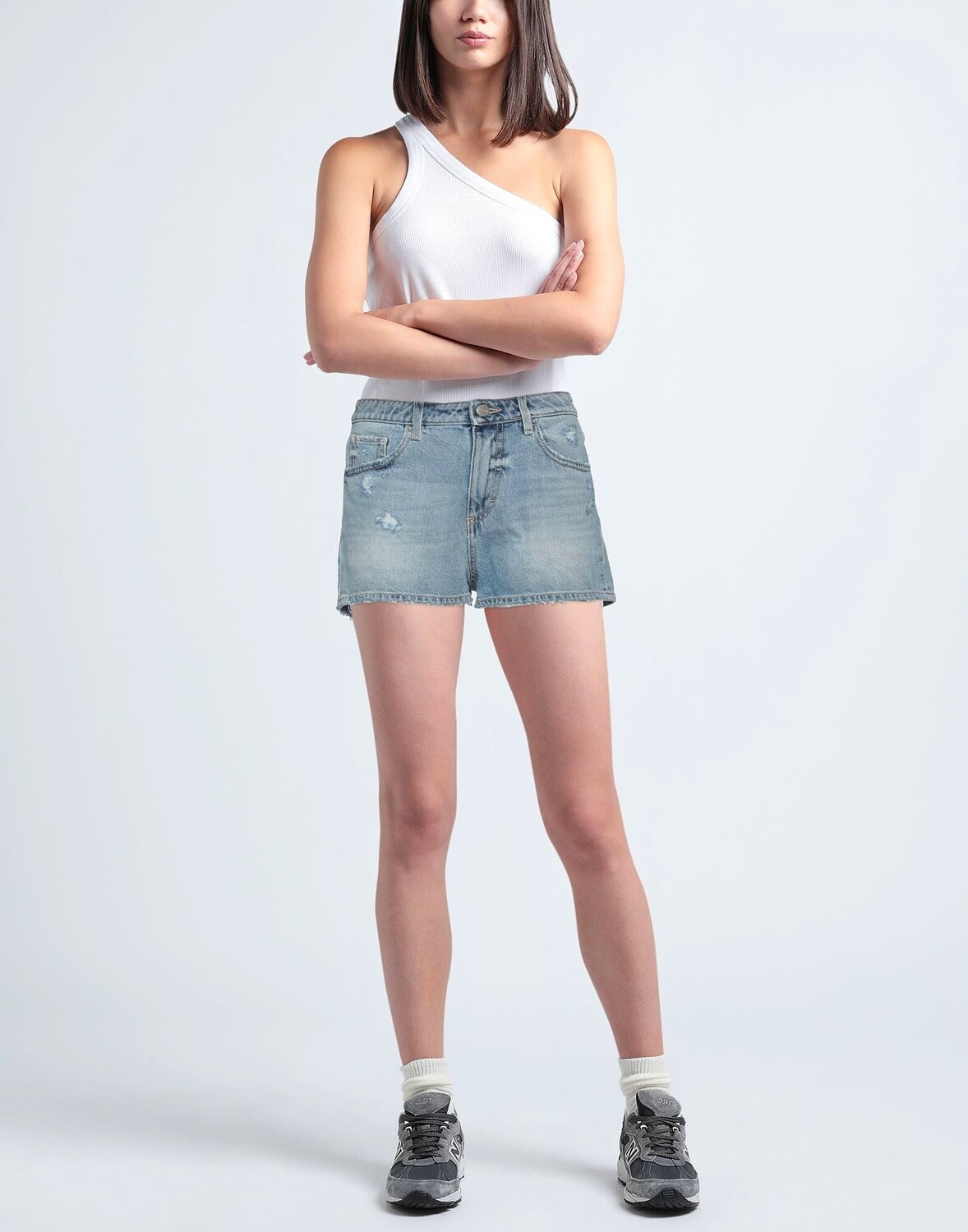 Джинсовая ткань, логотип бренда, одноцветное изделие, средняя степень стирки, завышенная талия, шлевки для ремня, приталенный крой, застежка-молния, 1 пуговица, шорты