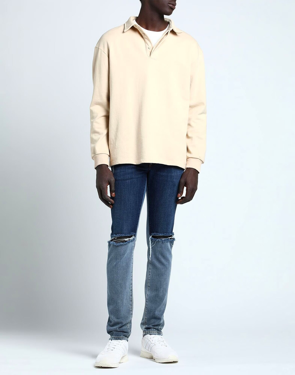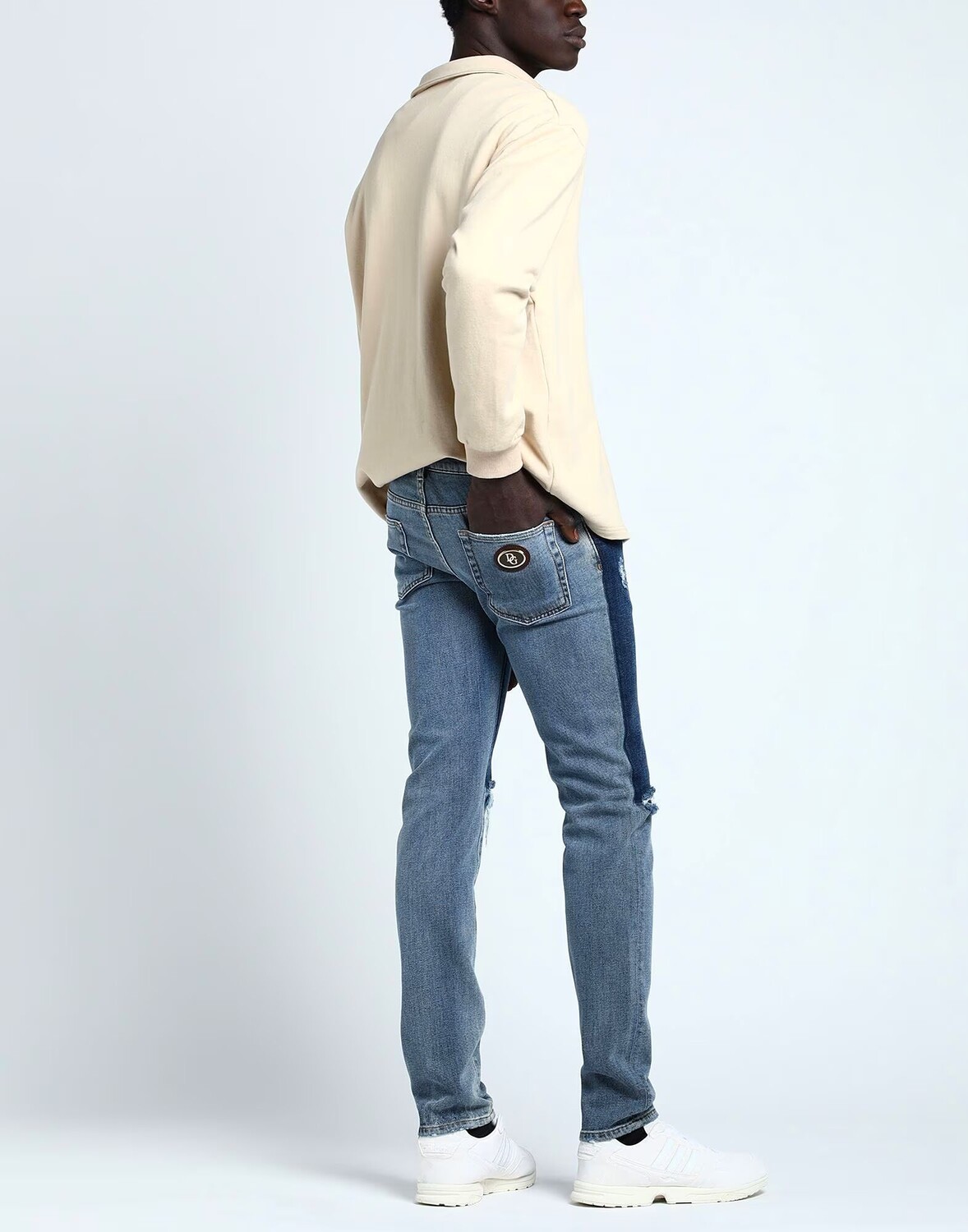 Деним, выцветший, рваная ткань, логотип бренда, кожаные аппликации, одноцветное изделие, темная стирка, заниженная талия, застежка-молния, пуговицы, пять карманов, стрейч, содержит нетекстильные части животного происхождения, модель скинни