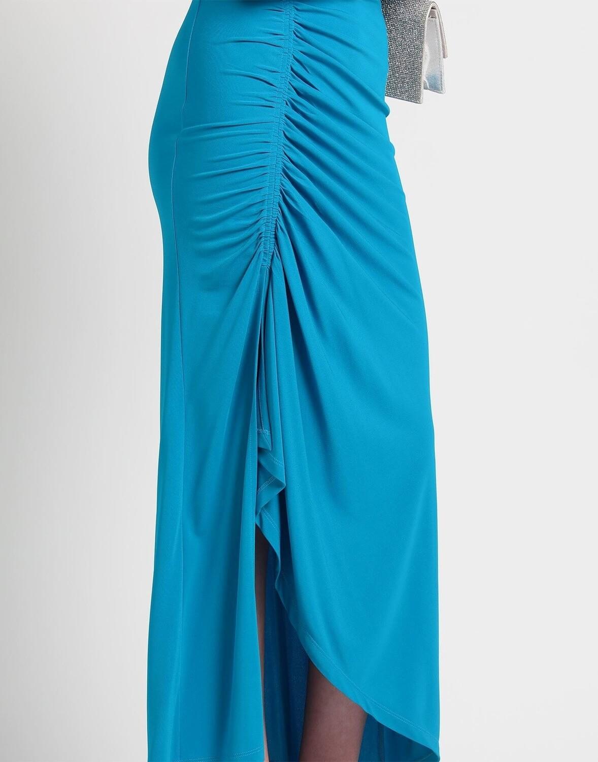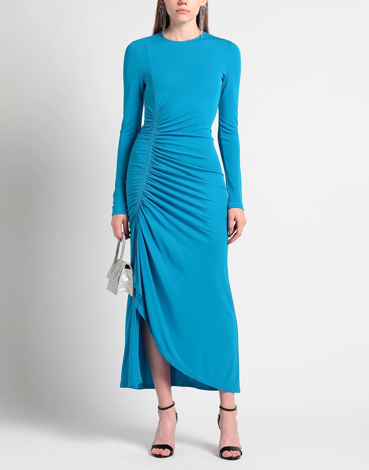 Креп, джерси, присборенные, одноцветное изделие, круглый вырез, длинные рукава, без подкладки, без карманов, химчистка, нельзя отбеливать, нельзя сушить в стиральной машине, облегающее платье